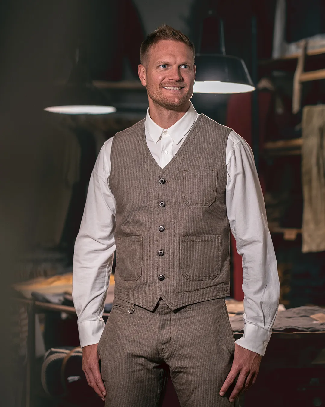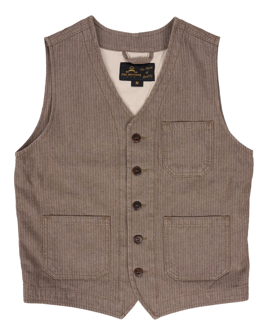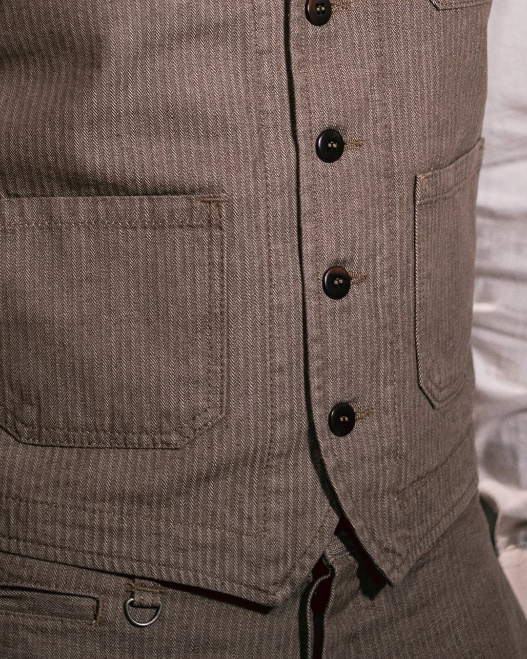 Nuestro chaleco Roamer HBT marrón 1937 está confeccionado con un denim especial Herringbone Selvage. Los chalecos han sido prelavados para mayor comodidad.