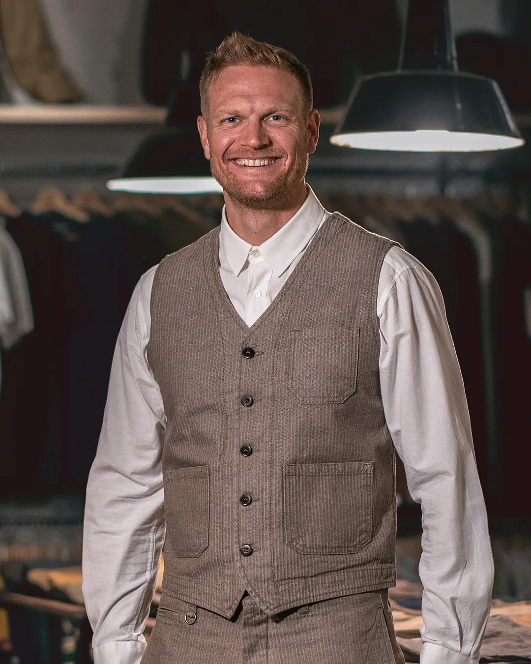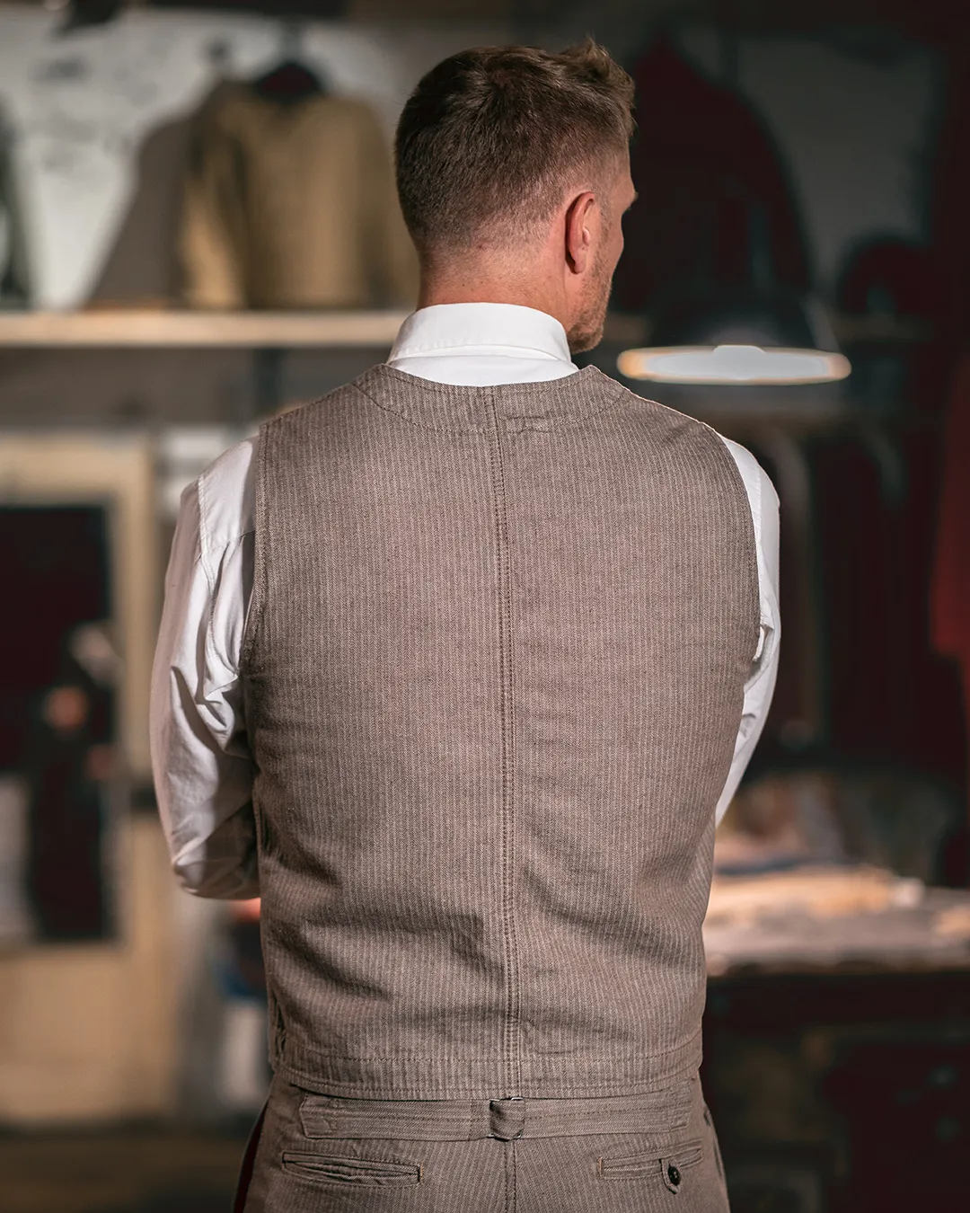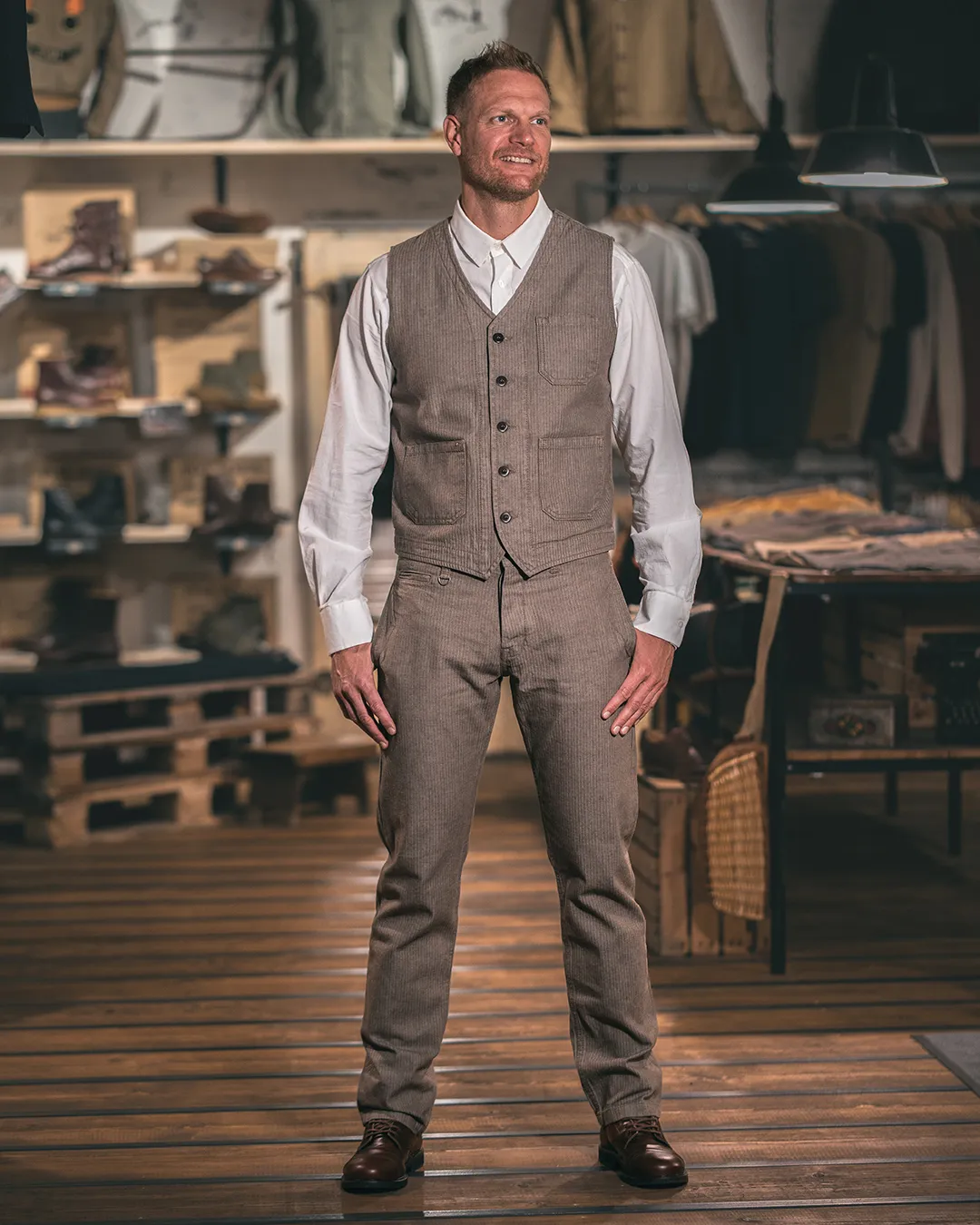 Nuestro chaleco Roamer HBT marrón 1937 está confeccionado con un denim especial Herringbone Selvage. Los chalecos han sido prelavados para mayor comodidad.