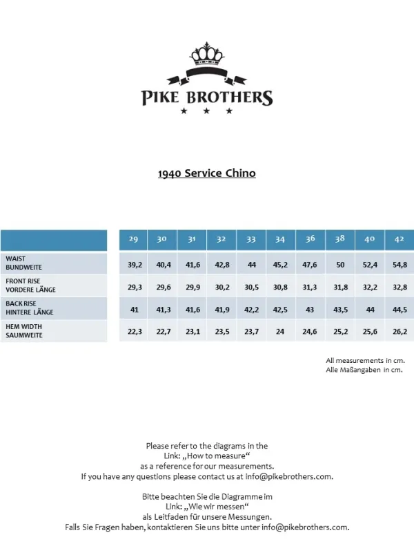 Los chinos de servicio originalmente estaban destinados a usarse en el campo como parte del uniforme, así como también como vestimenta formal. Por lo tanto, el ajuste era amplio y cómodo para una amplia gama de movimientos. Una vez lavado y planchado, tenía un aspecto elegante y adecuado. Para el tejido utilizamos una auténtica sarga de caballería.