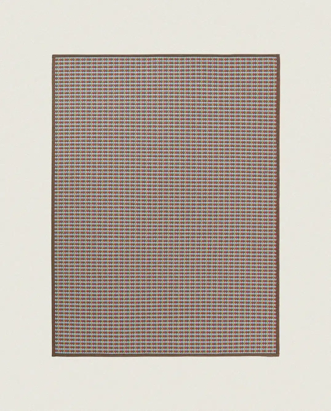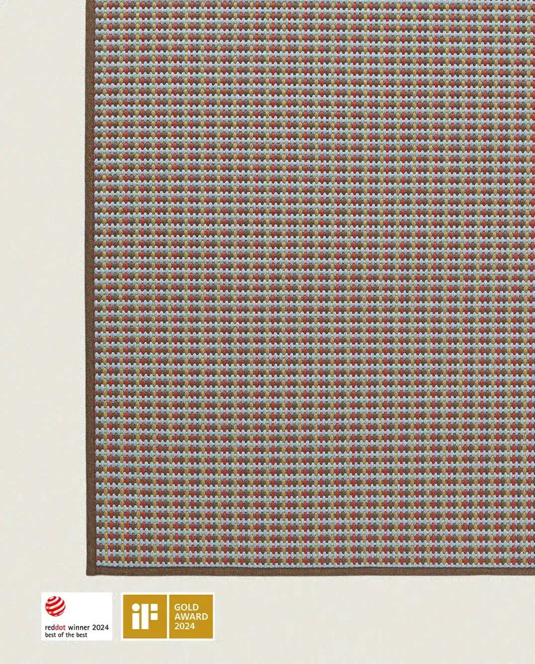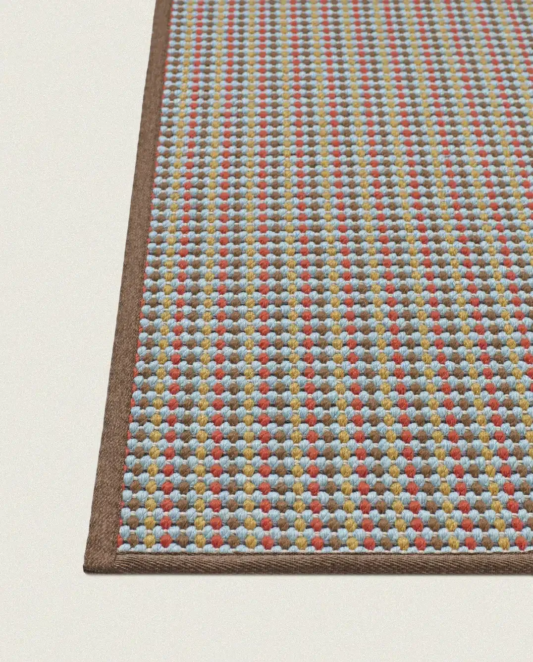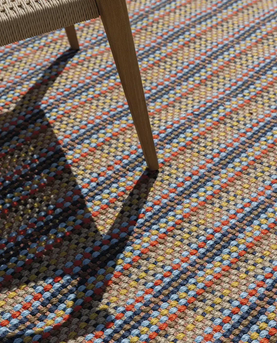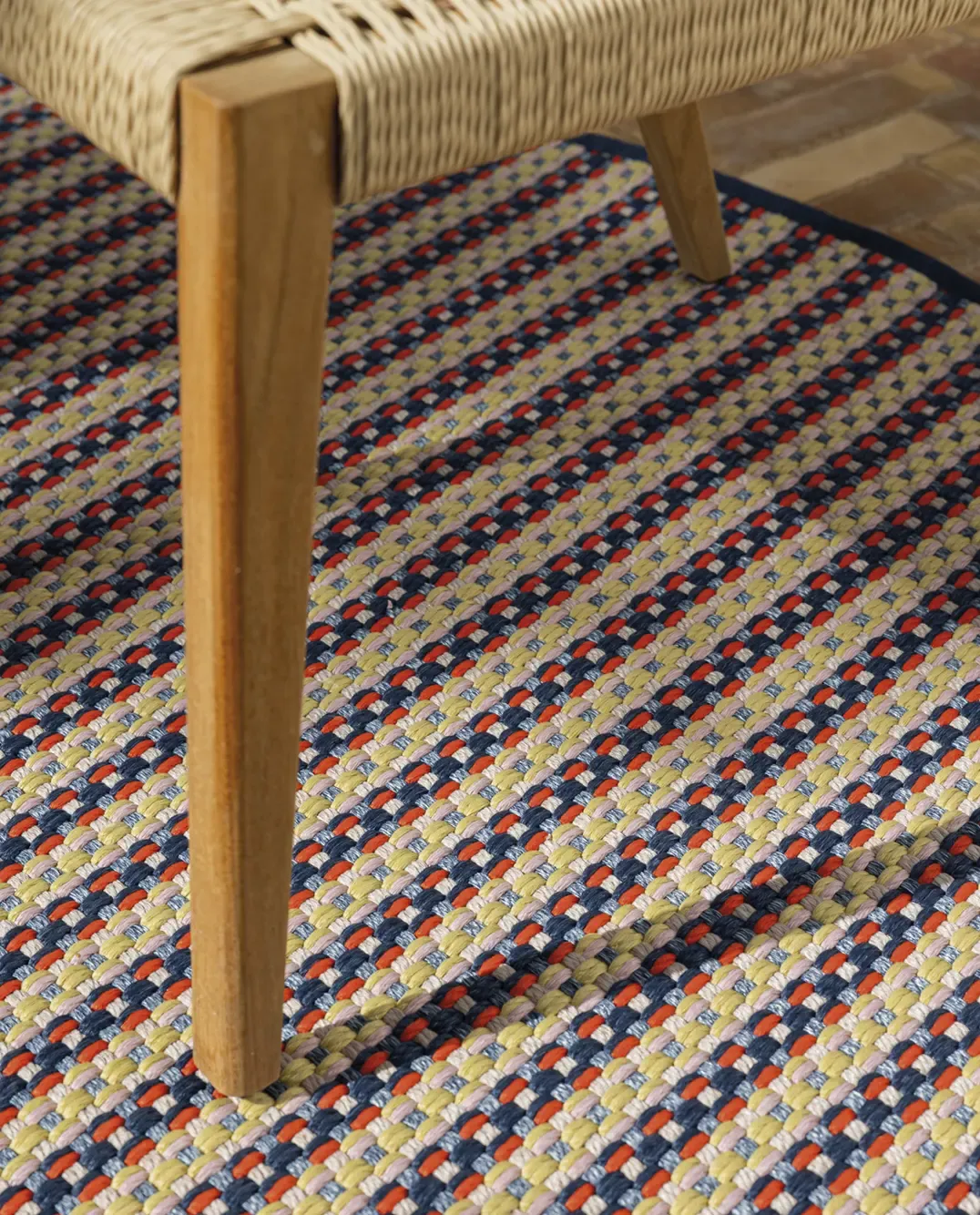 Maravillosa alfombra circular apta para interior y exterior, fabricada en telar de tejido plano de varios colores y con un tratamiento UV incorporado en las fibras que permite su uso interior y exterior con solidez del color a la luz. Apta para uso con suelo radiante.