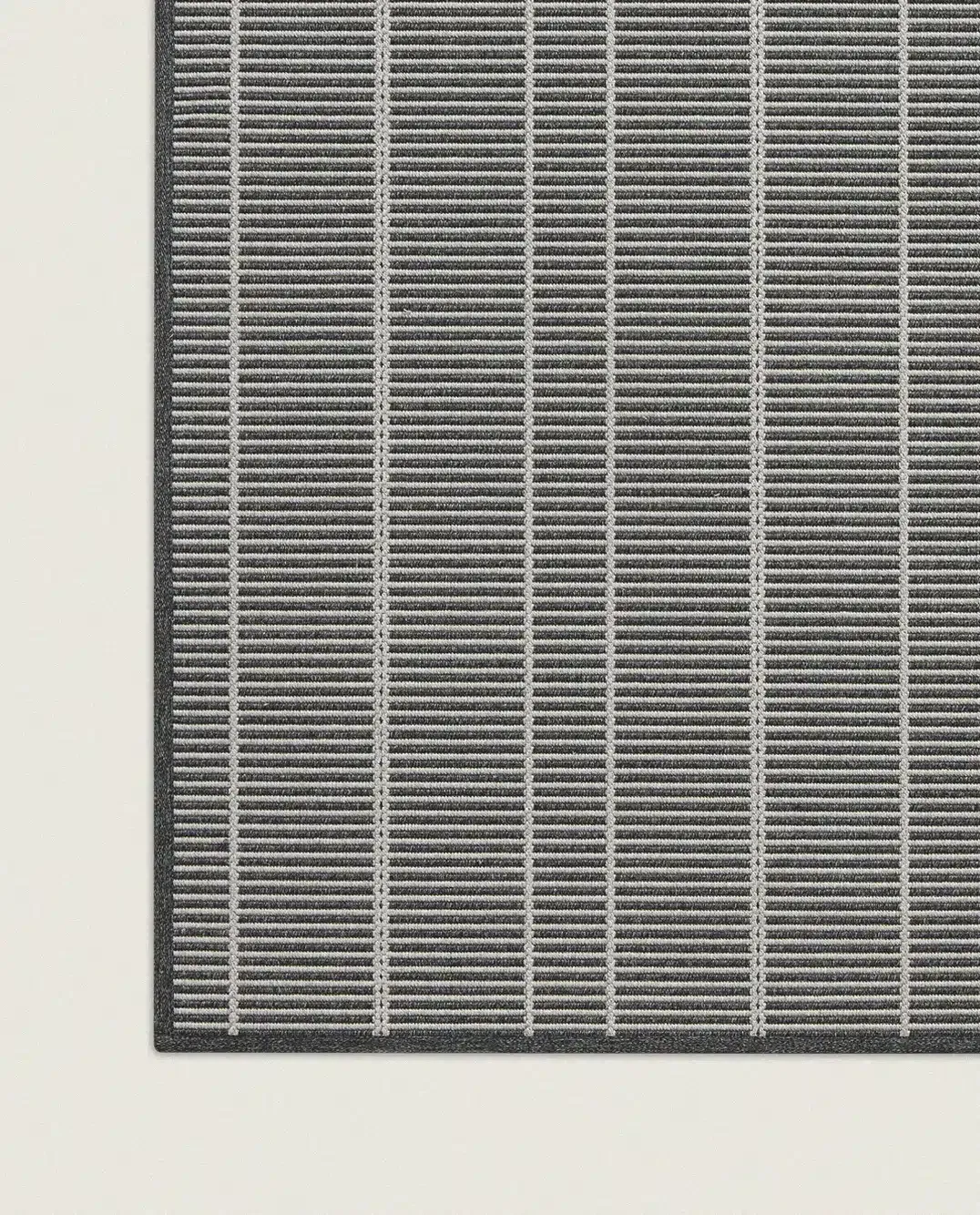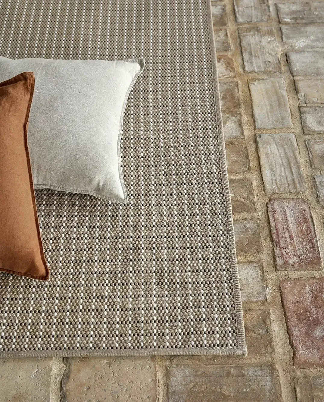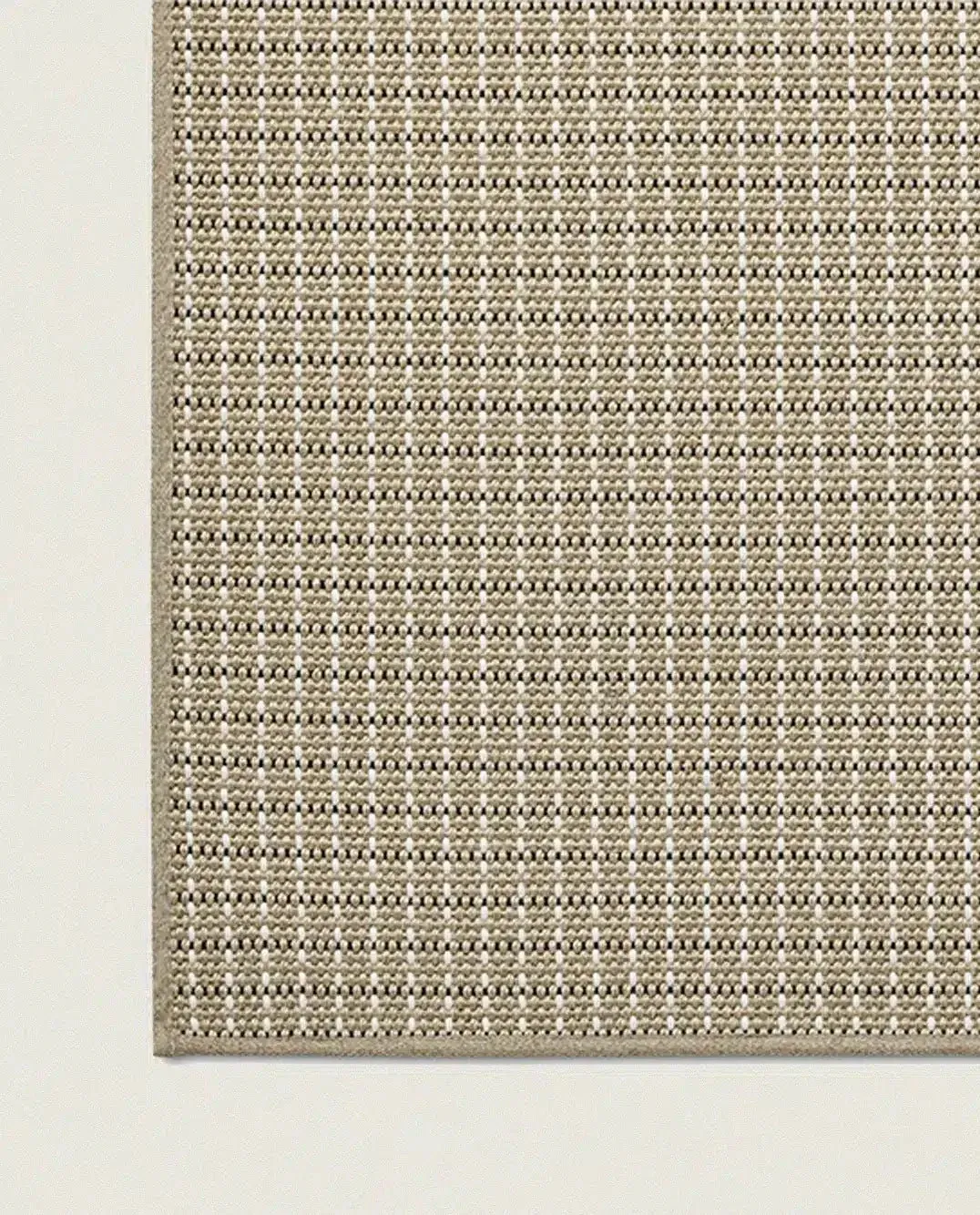 Maravillosa alfombra rectangular apta para interior y exterior, fabricada en telar de tejido plano y con un tratamiento UV incorporado en las fibras que permite su uso interior y exterior con solidez del color a la luz. Apta para uso con suelo radiante.