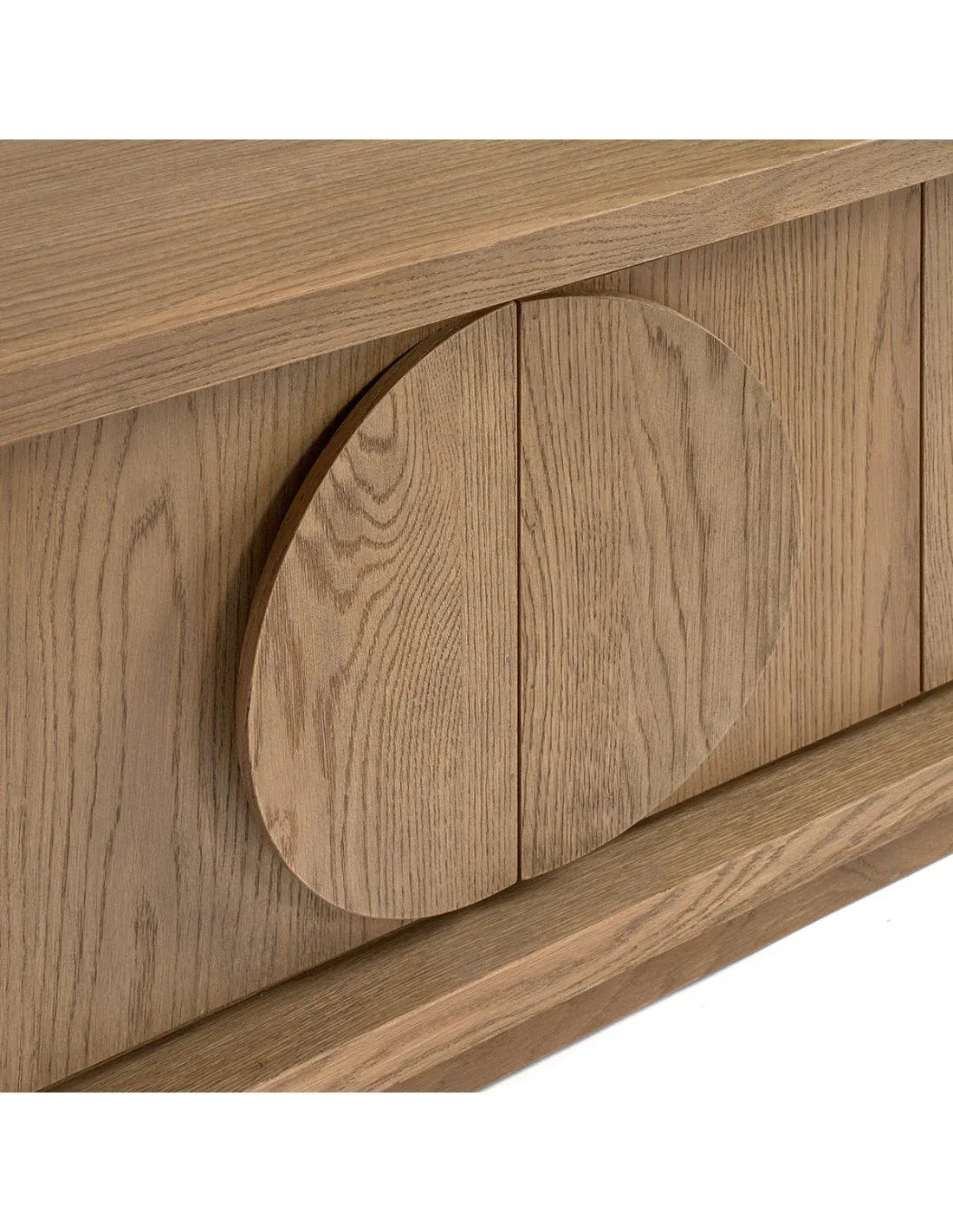 Aparador acabado en roble natural con 6 puertas de gran dimensión y gran capacidad de almacenaje. Su estructura de líneas rectas aportan un toque sofisticado mientras que los detalles de las puertas redondeados aportan calidez y armonía a la pieza. Un aparador con mucha personalidad que será sin duda protagonista en la sala de estar.