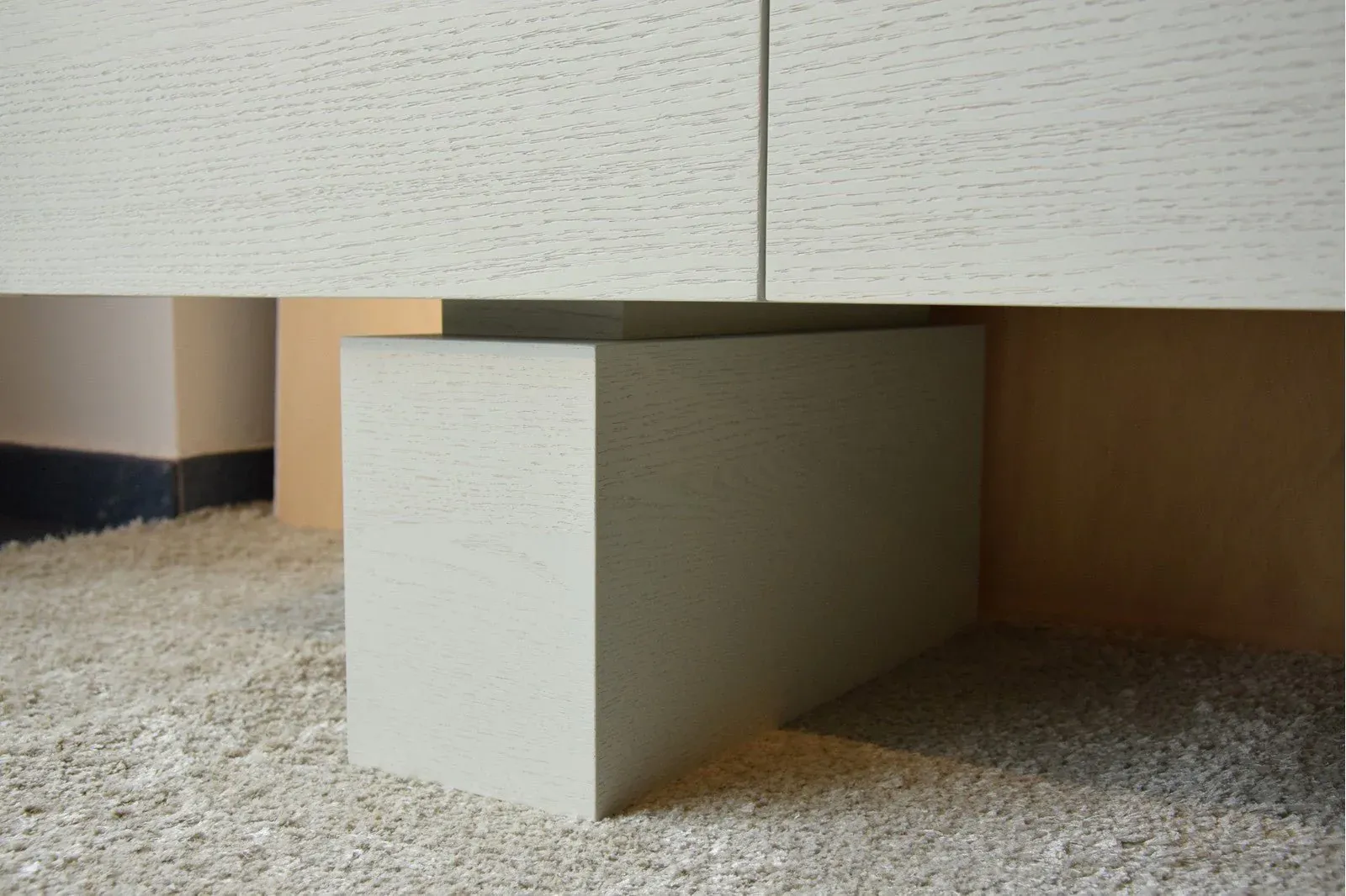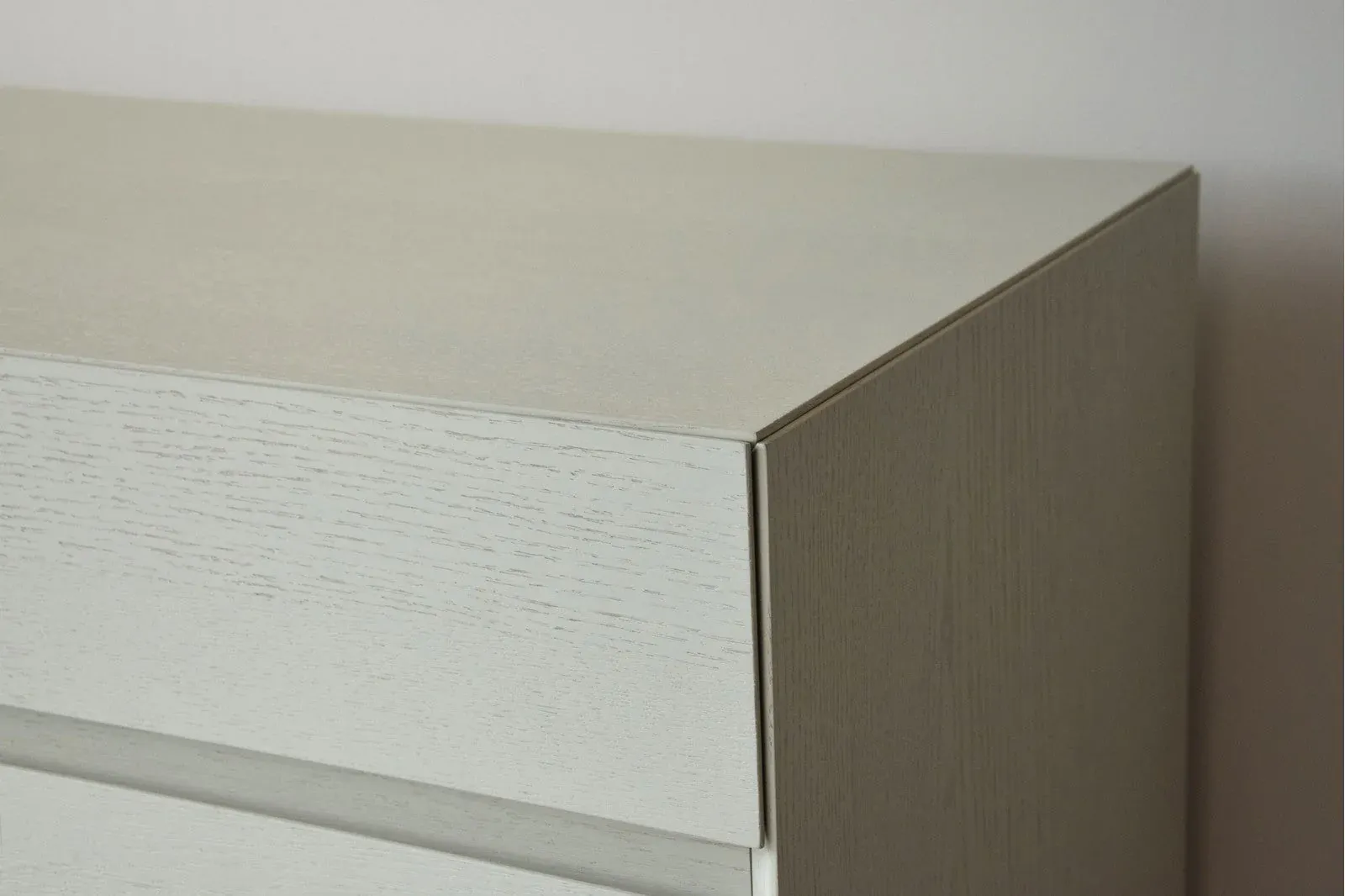 Aparador Caylar fabricado en DM rechapado en madera de roble natural en color blanco roto mate que deja a la vista la veta natural de la madera. Cuenta con 4 cajones y 4 puertas.