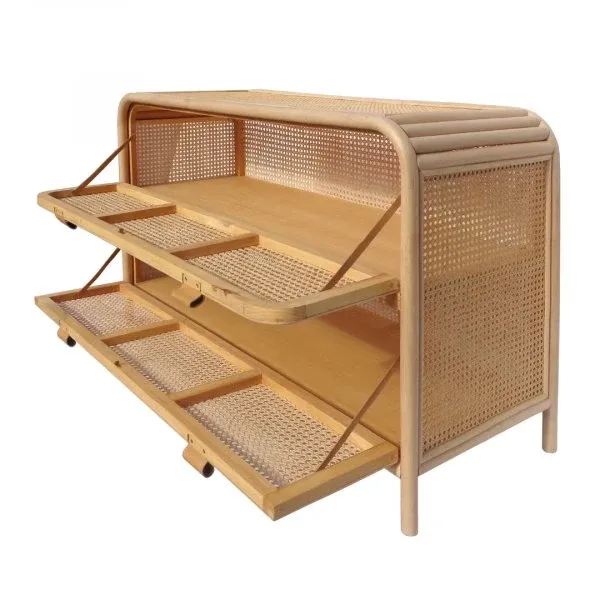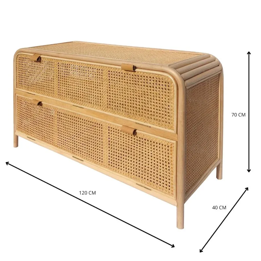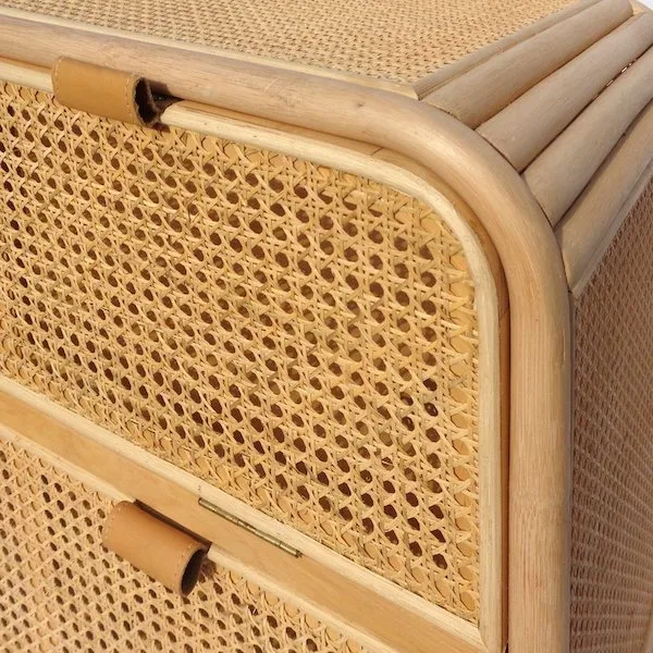 Estantería Vetel fabricada en madera de teca y ratán en color natural.