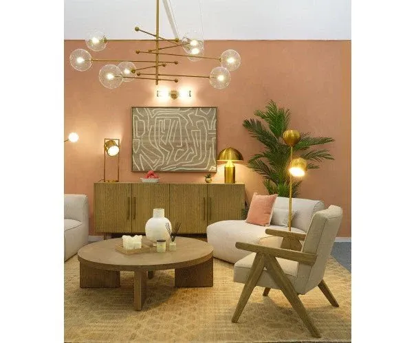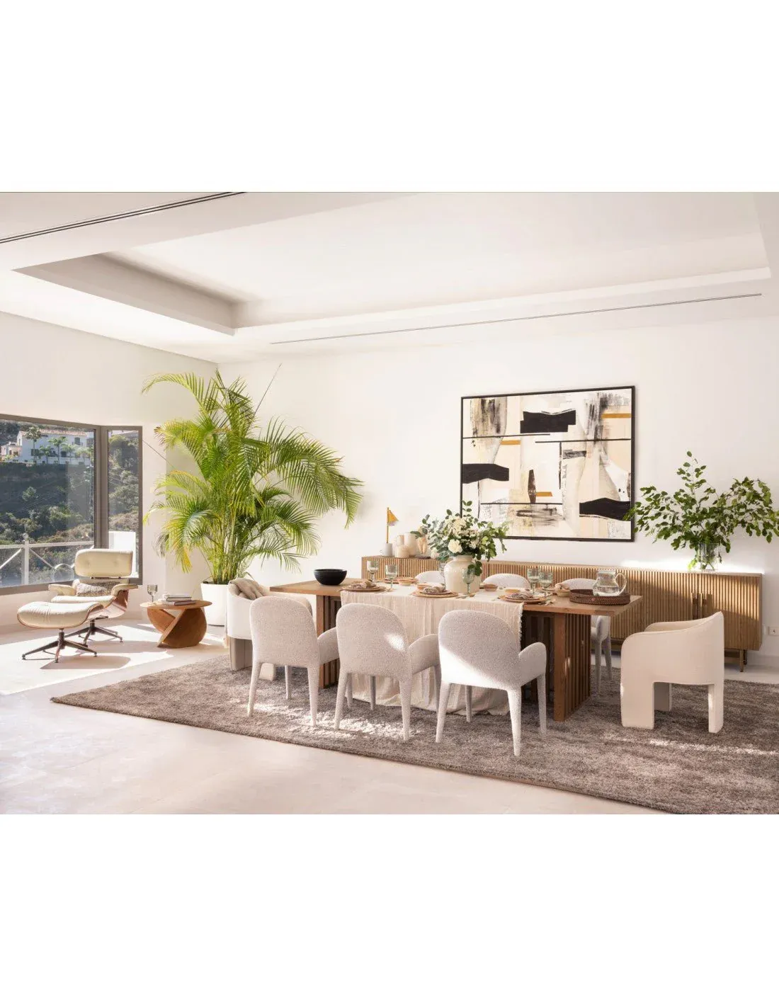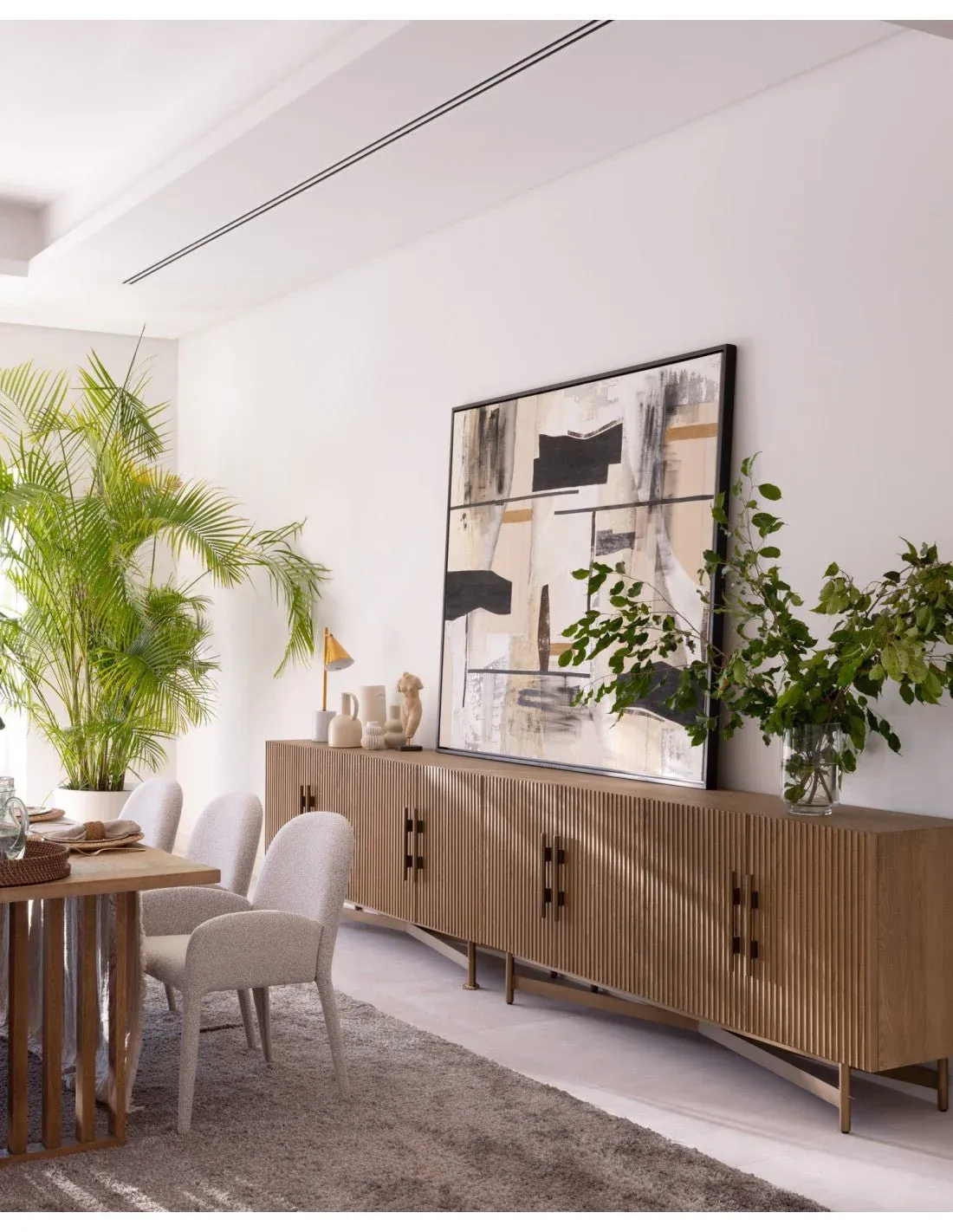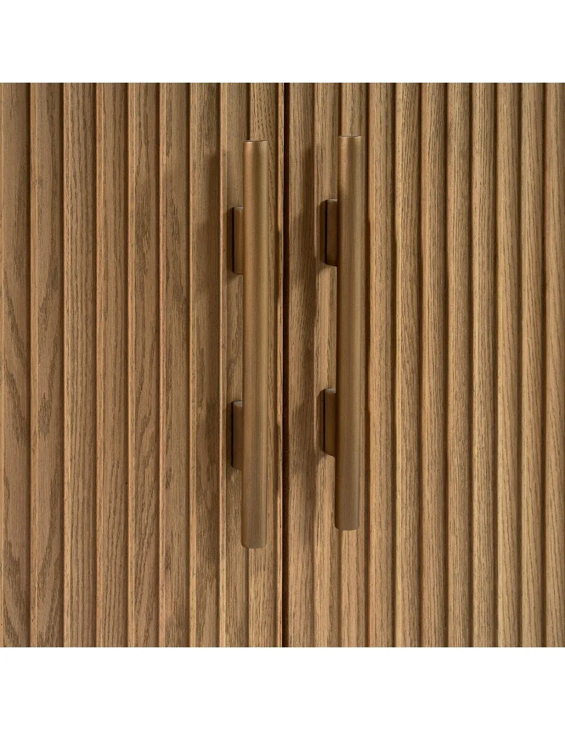 Aparador acabado de madera de roble natural. Cuenta con 4 puertas de madera de roble alistonado en última tendencia con tiradores rectos metálicos para dar ese toque moderno. Base con formas de líneas rectas metálicas lacadas en color dorado aportan ligereza a la pieza y tu ambiente y elevan el mueble de la superficie. En su interior cuenta con una balda para dividir su capacidad de almacenaje.