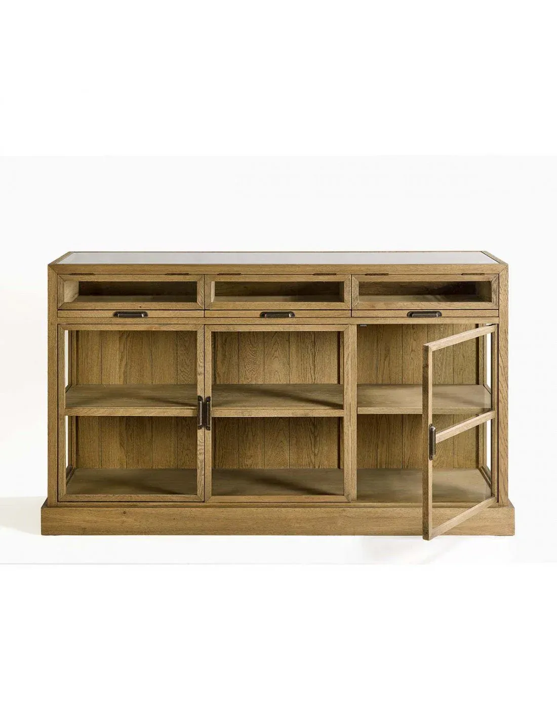 Aparador de madera de roble con acabado en cepillado natural. Este aparador es perfecto si necesitas un mueble con gran capacidad de almacenaje. Cuenta con tres cajoneras con el frontal acristalado, para que deposites objetos de pequeñas dimensiones o documentos; y en la zona inferior, tres amplios huecos separados por una balda interior. Una pieza ideal, que le dará un toque rústico a tu hogar.