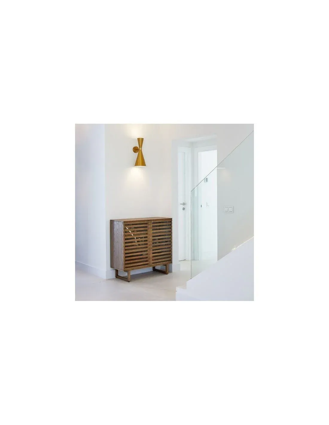 Aparador acabado en madera natural con pata de madera. Puertas de palillería en madera del mismo tono y parte interior de la puerta en cristal transparente. Cuenta con 3 baldas en su interior en las que la primera y tercera son ajustables. Permiten inclinación para usar como zapatero o utilizar rectas para otro tipo de almacenaje. Su estructura y diseño permiten utilizar la pieza como zapatero. Un diseño moderno y ligero a la vez que resistente.