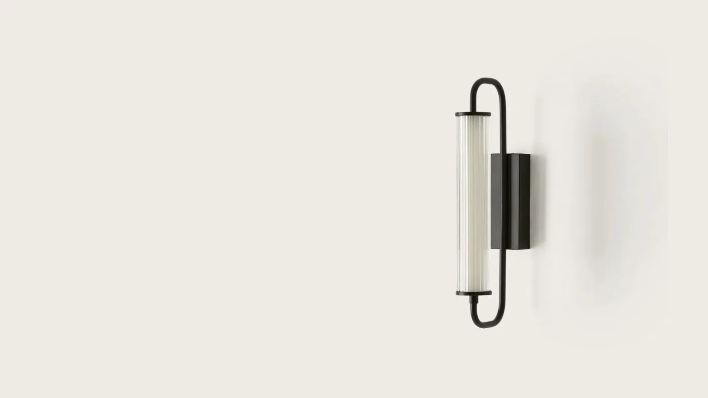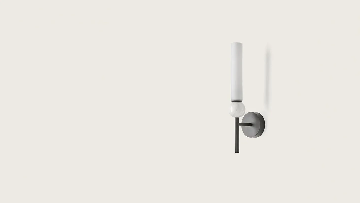 Aplique de pared de diseño vintage con estructura de acero en color dorado ó negro y tulipa de cristal opal ó transparente. En la imagen, la tulipa es de acabado opal.