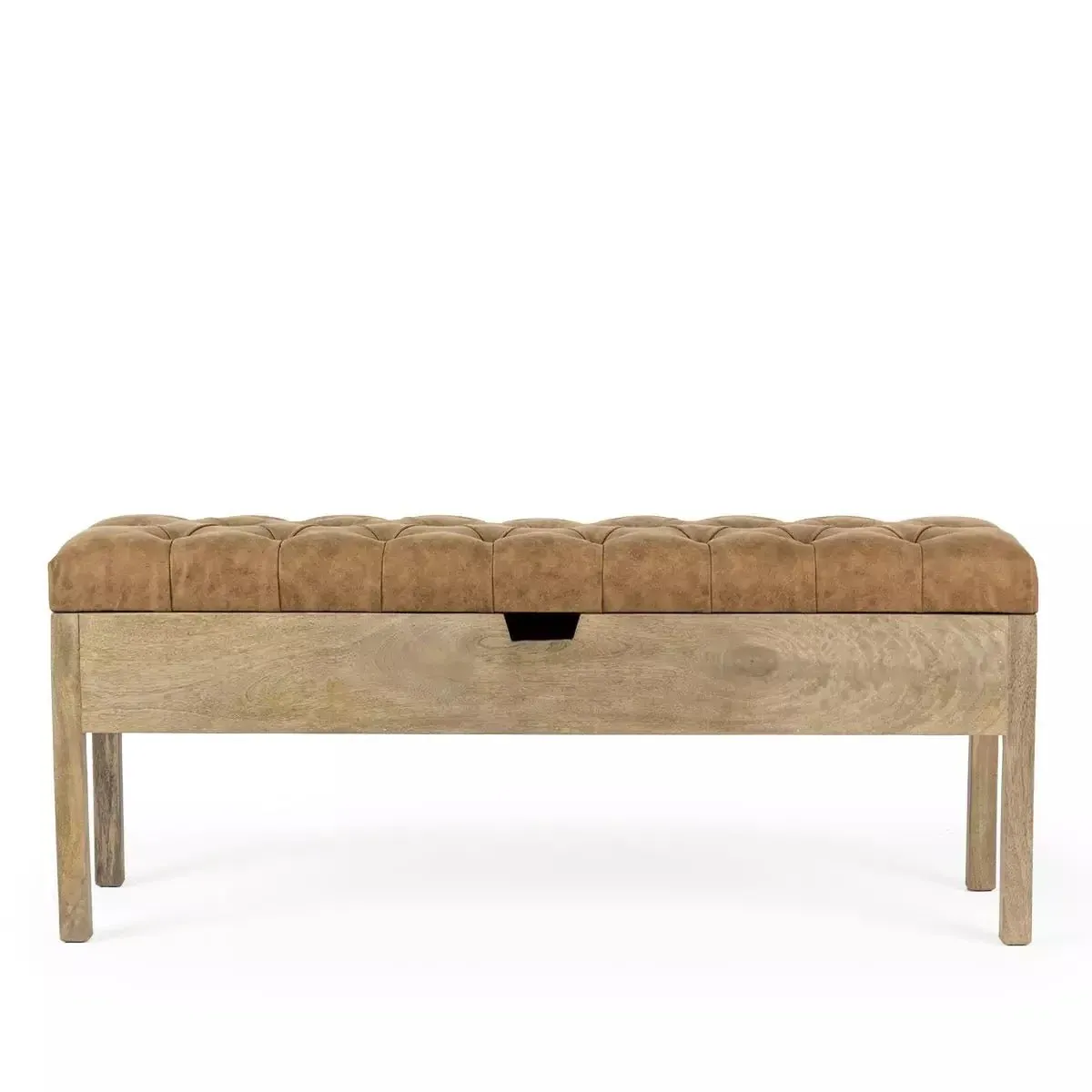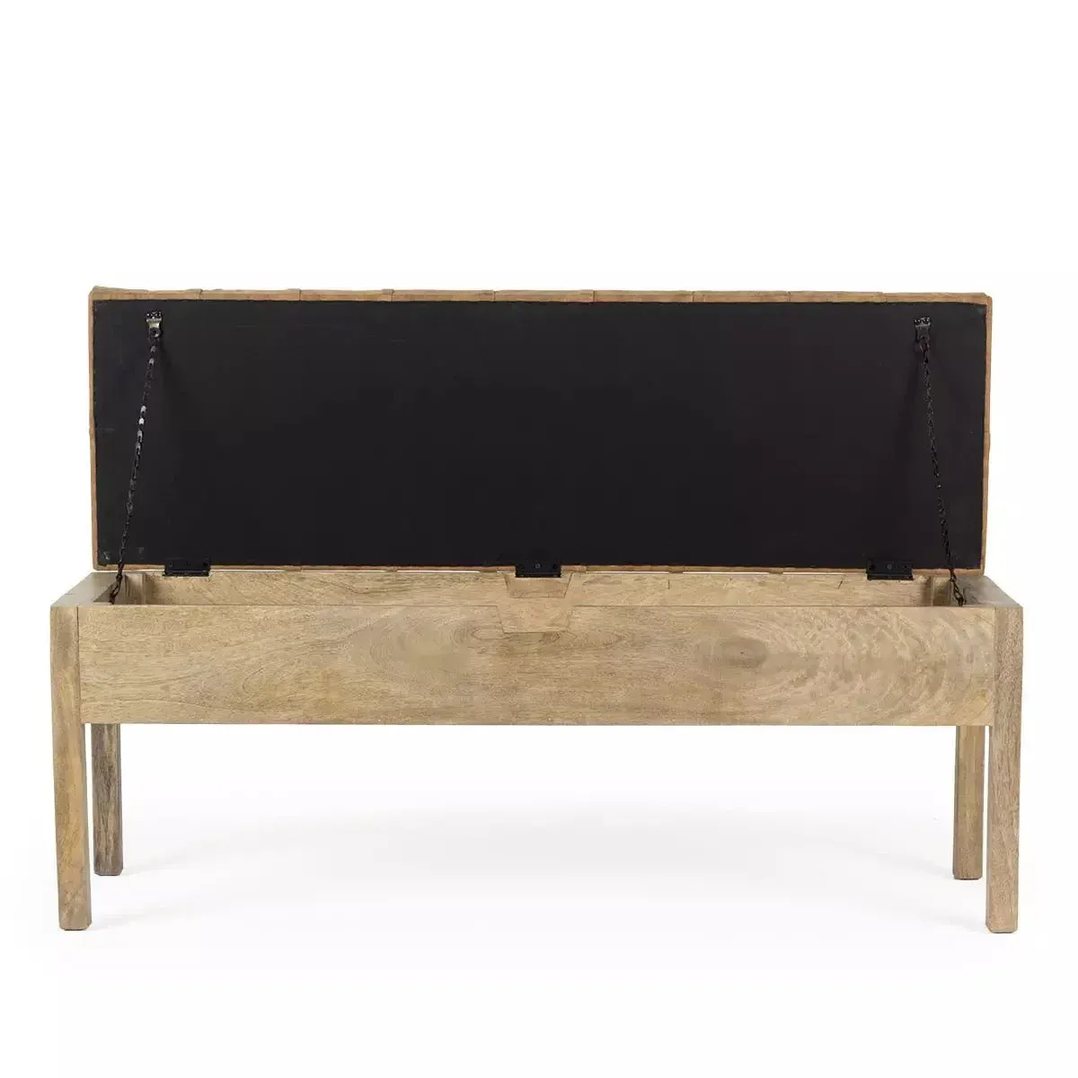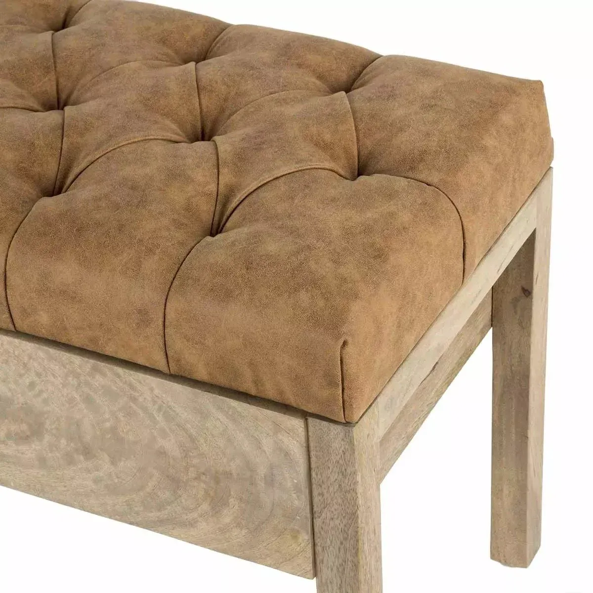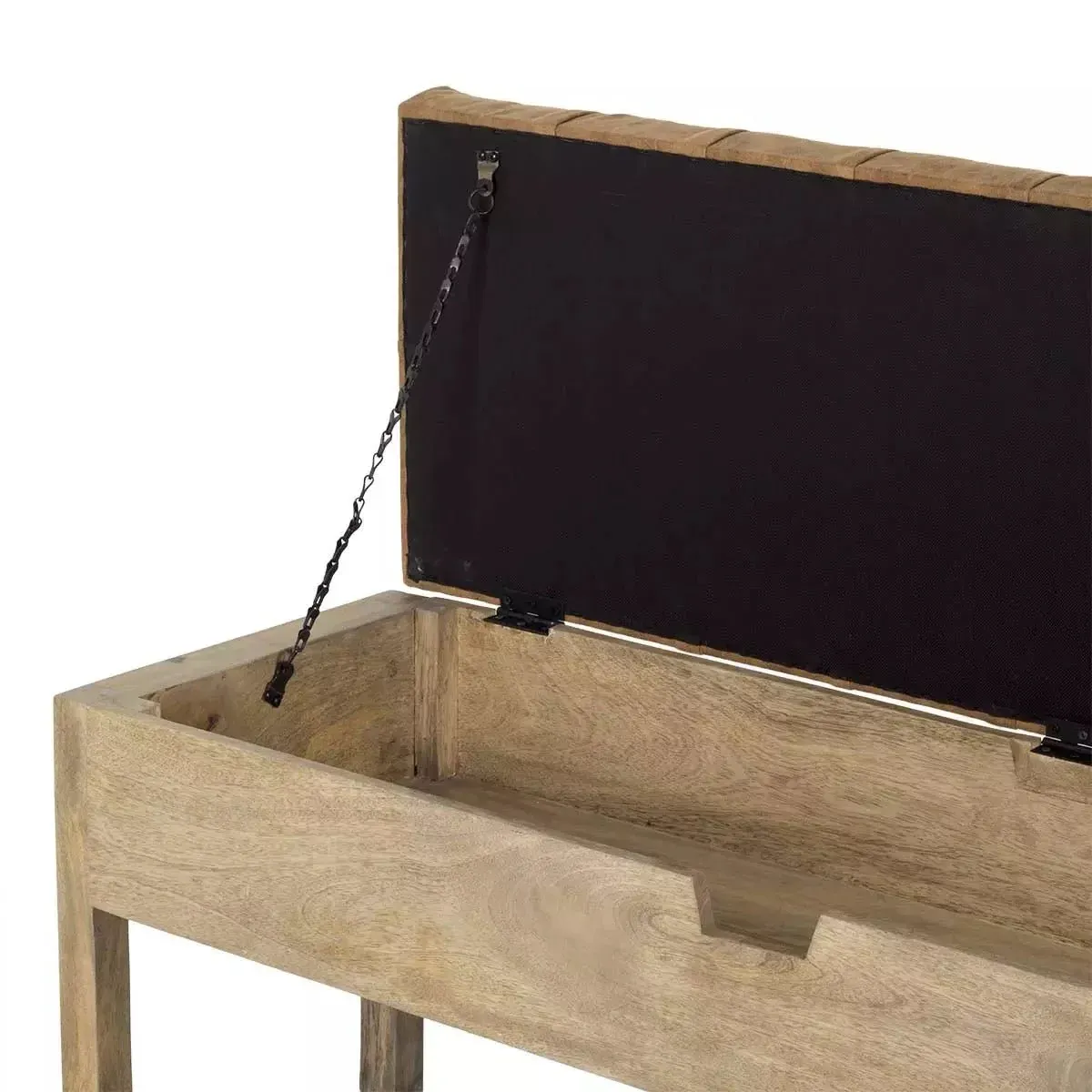 Banco Félix fabricado en madera de mango con arcón de almanecimiento. Asiento en polipiel y con capitóne. Práctico, funcional y con un diseño que le aporta un toque especial. Quedará perfecto en ambientes de estilo natural o industrial, boho, nórdico, mediterráneo o tropical.