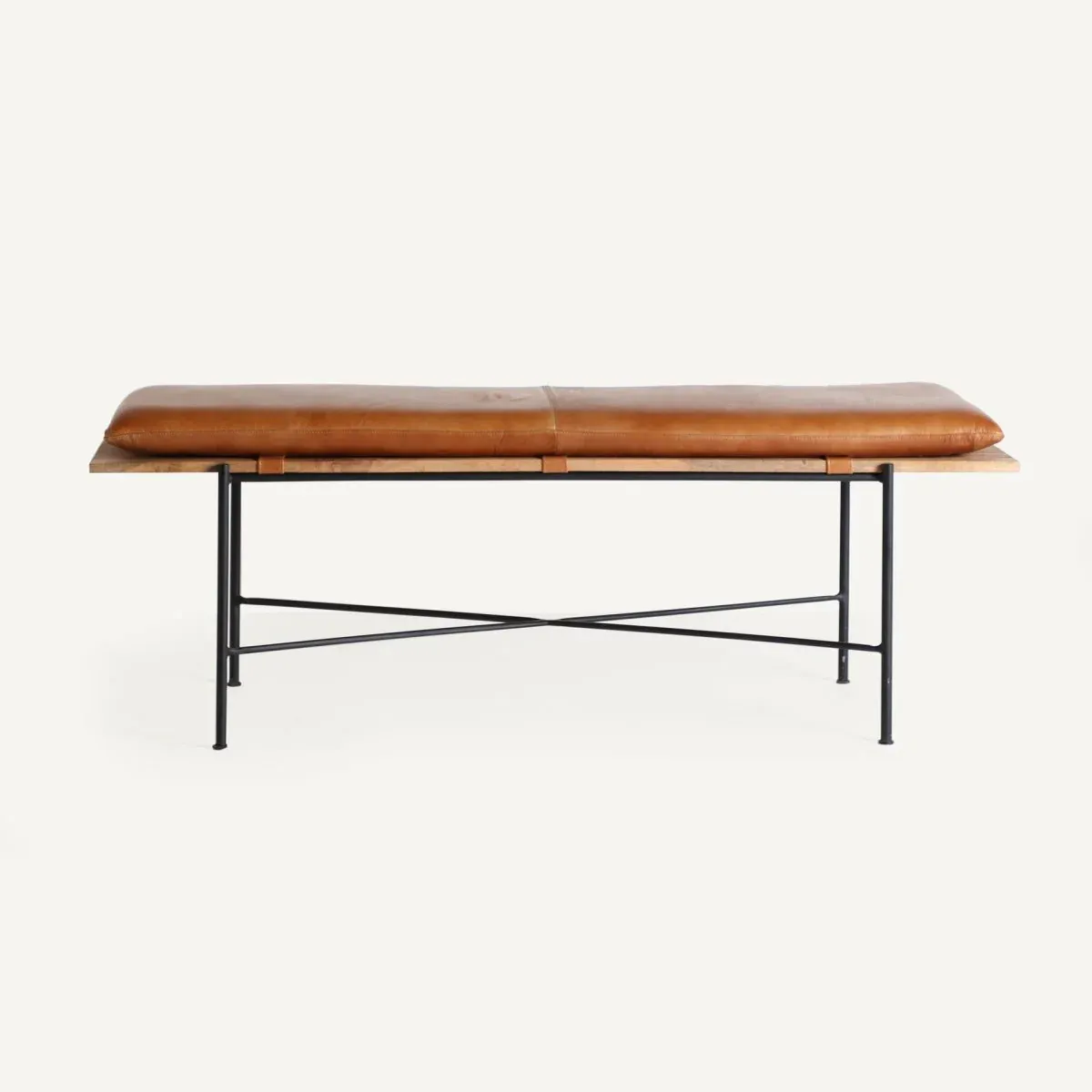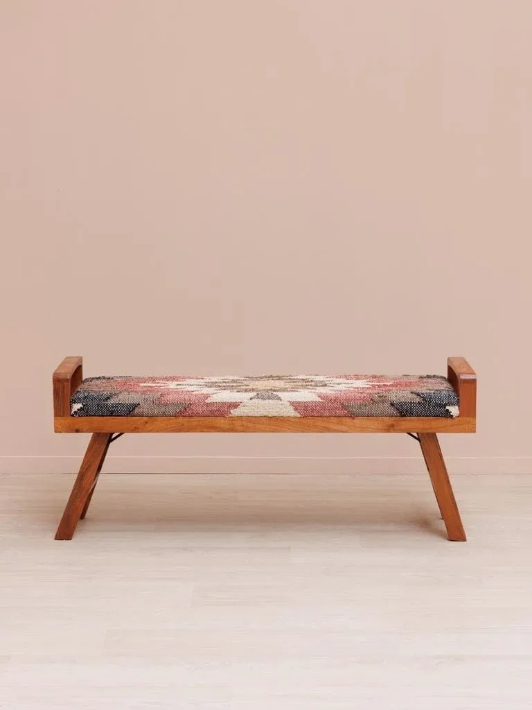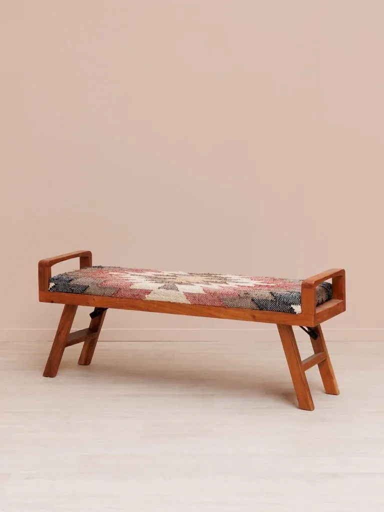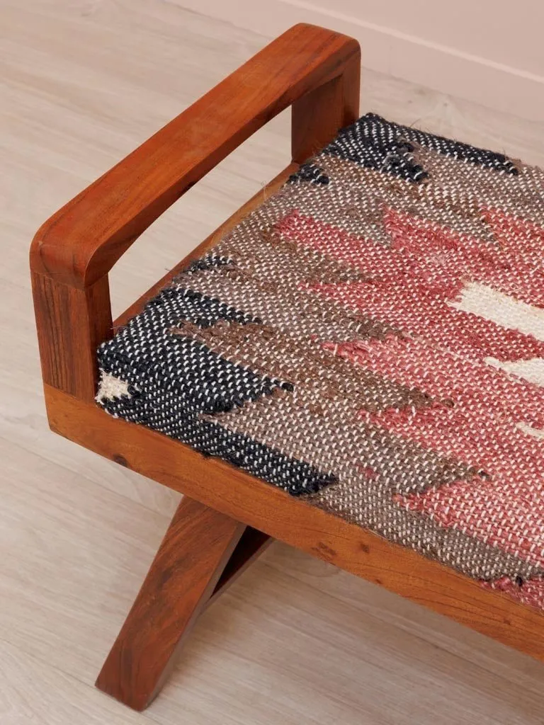 Precioso banco kilim en madera de acacia color marrón, cánamo y algodón.