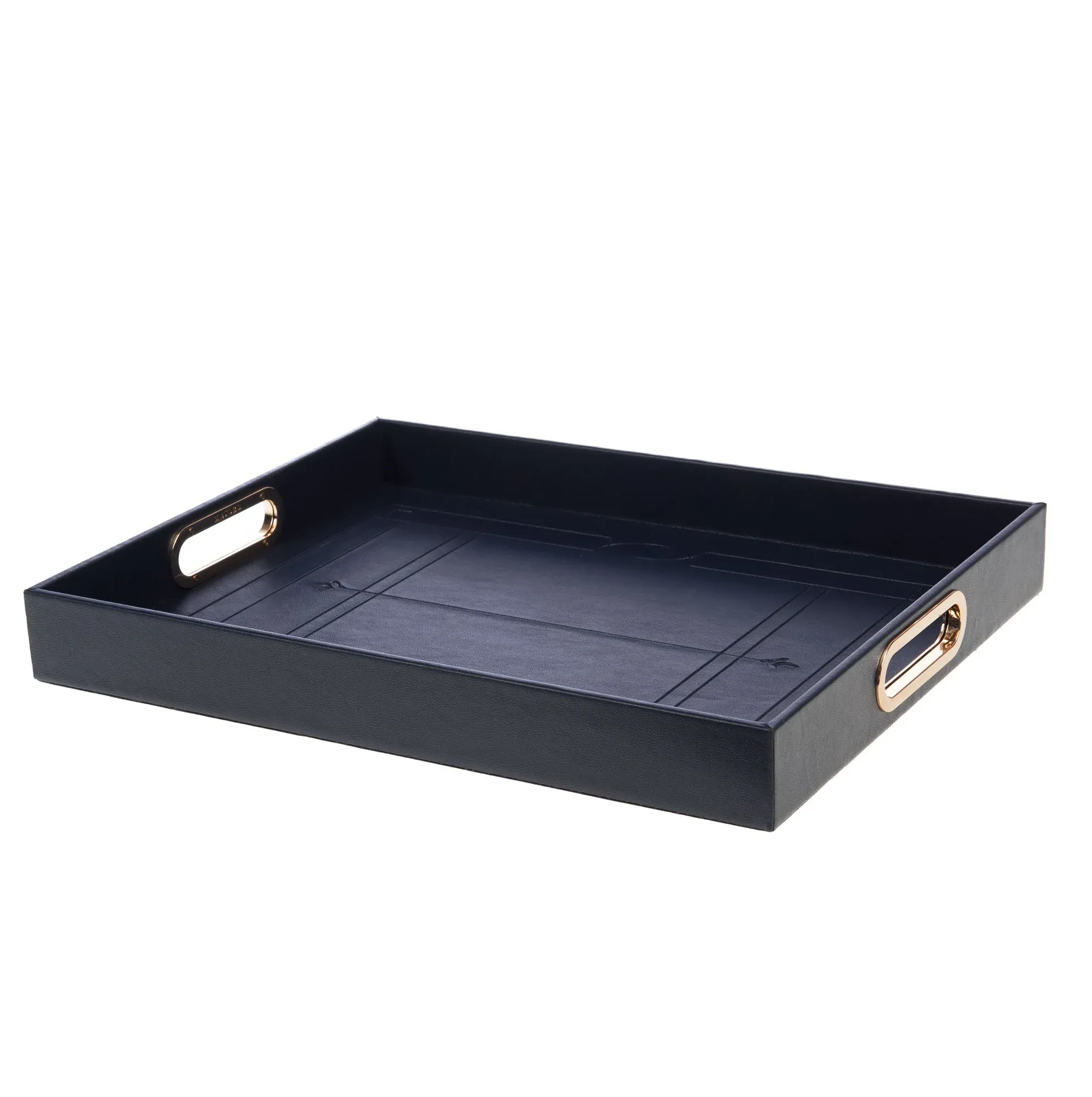 Preciosa bandeja de color azul con asas doradas fabricada en poliuretano efecto piel.