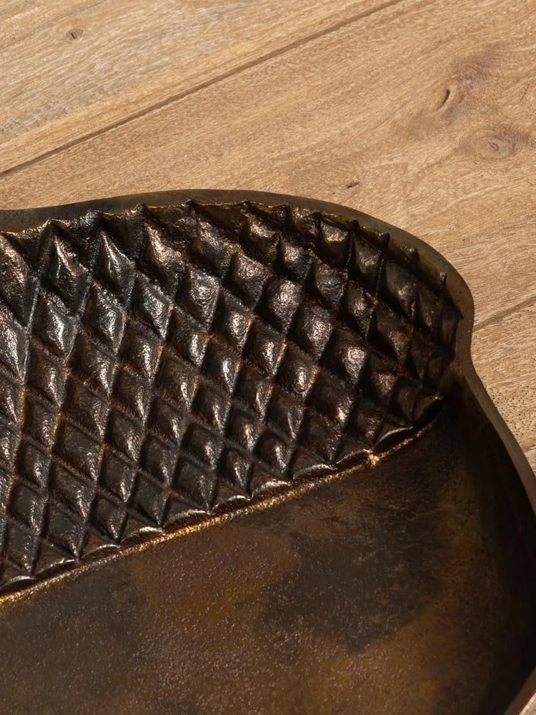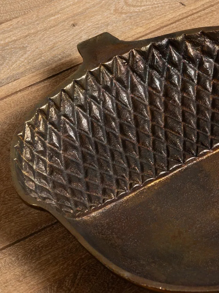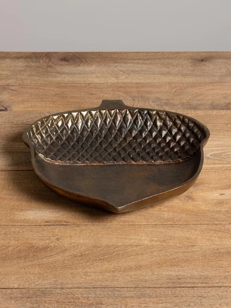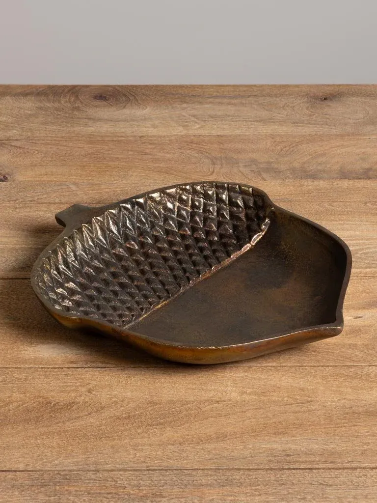 Preciosa bandeja en forma de bellota fabricada en aluminio de color bronce.