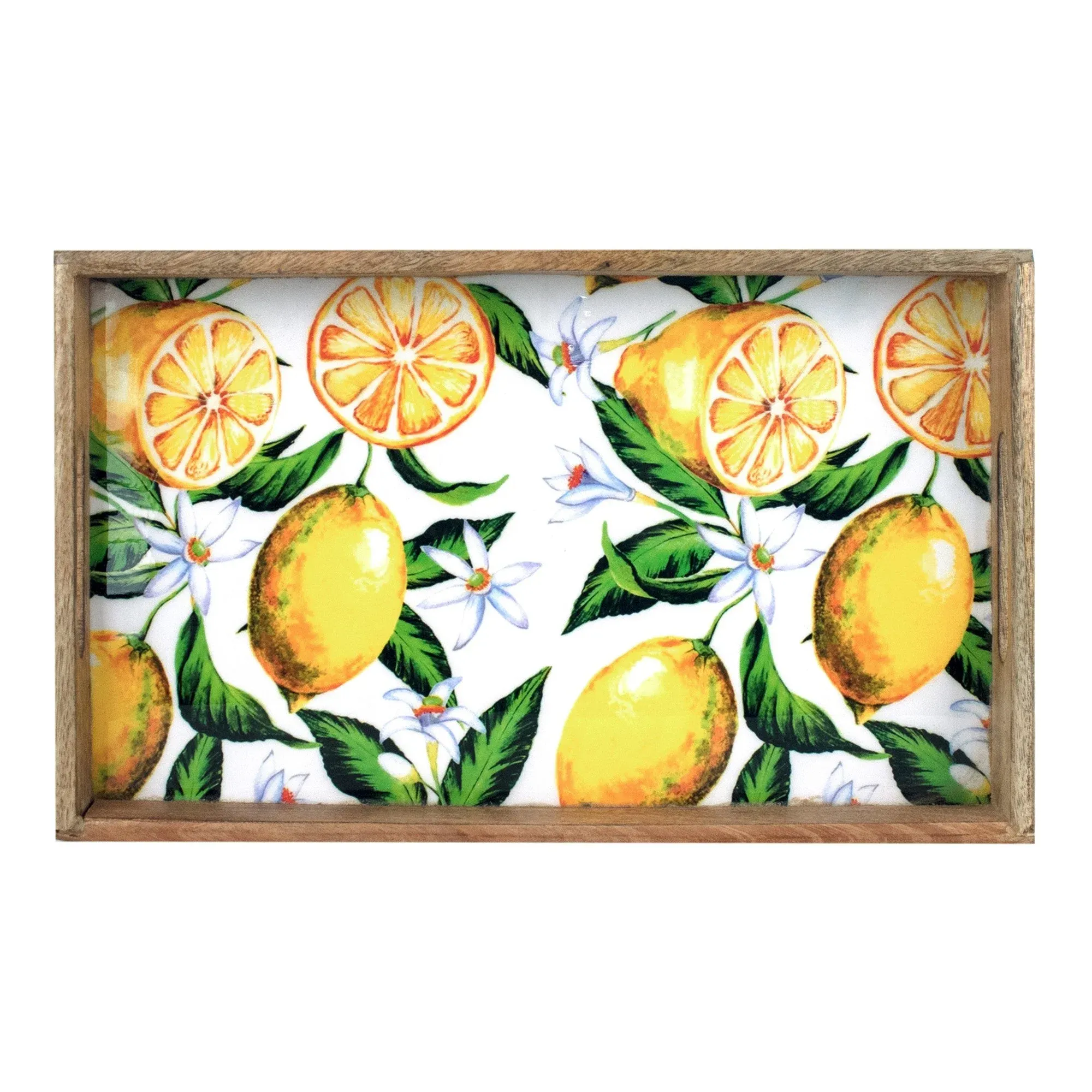 Bandeja rectangular fabricada en madera natural con dibujos de limones en la base de color blanco y amarillo.