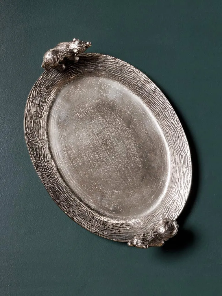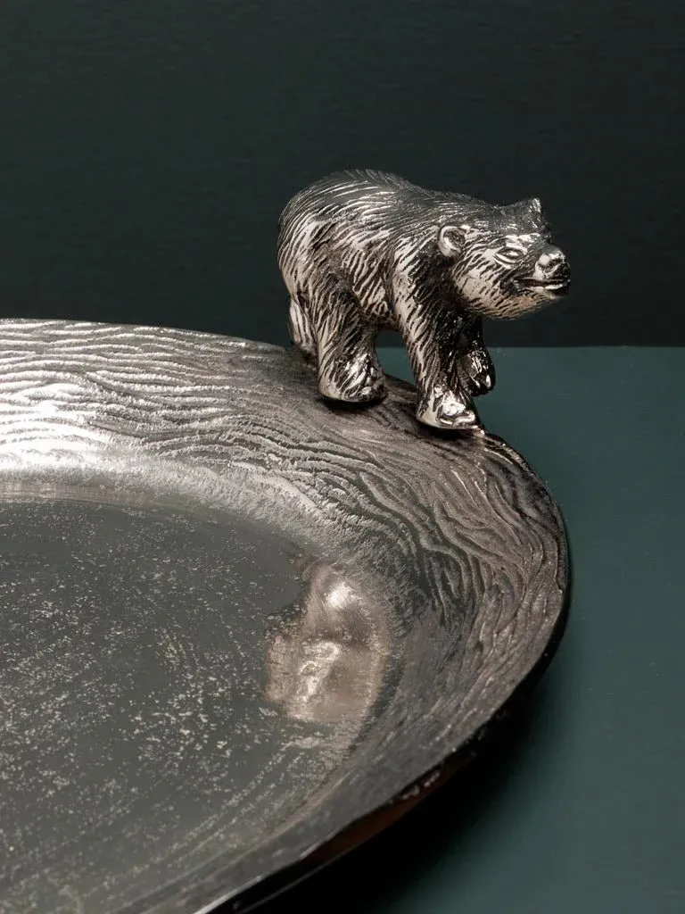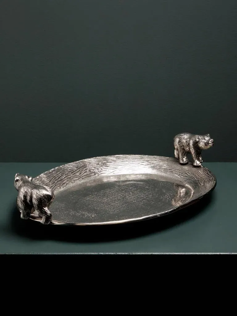 Preciosa bandeja con dos osos en los extremos fabricada en aluminio color plateado.
