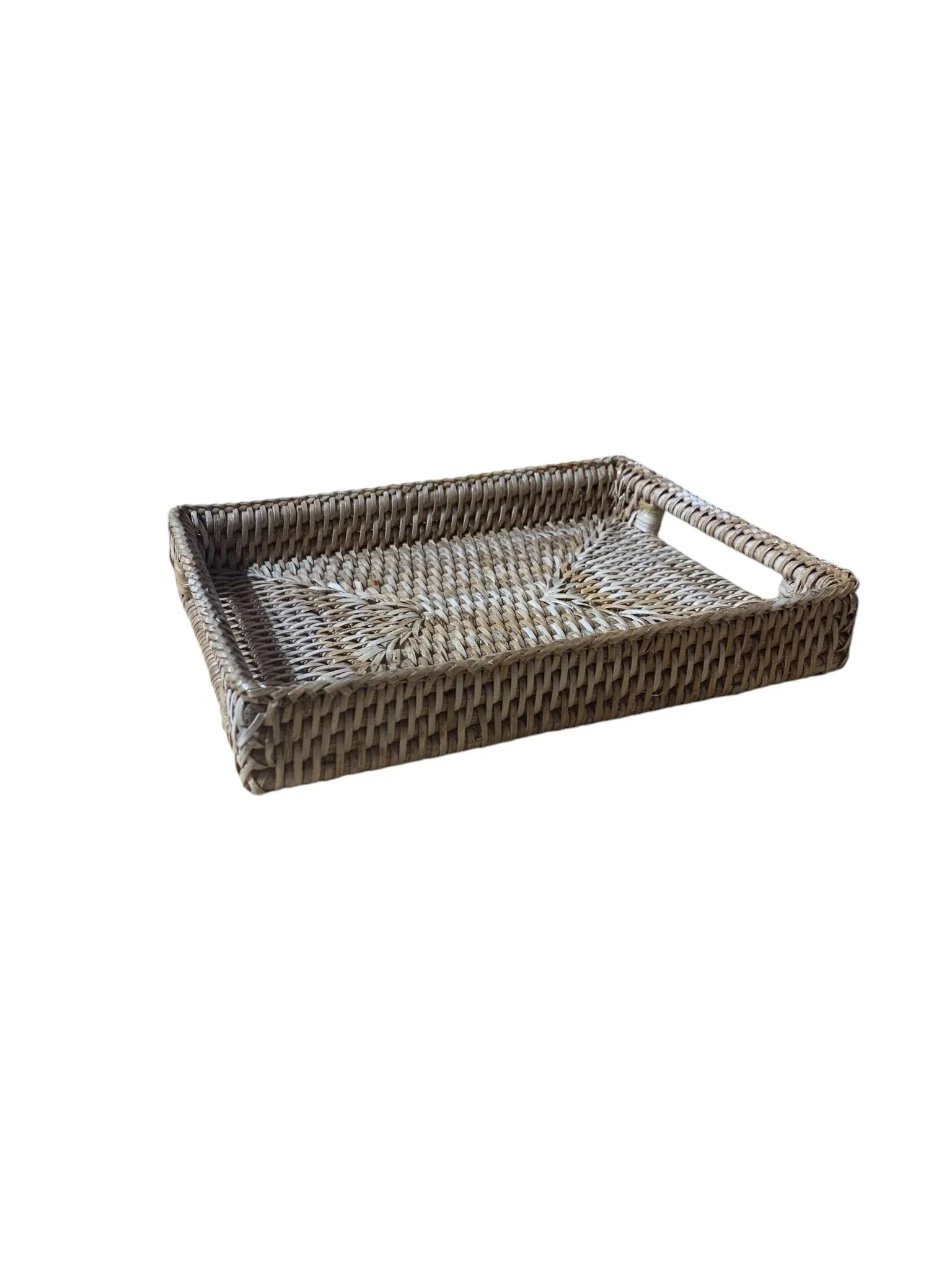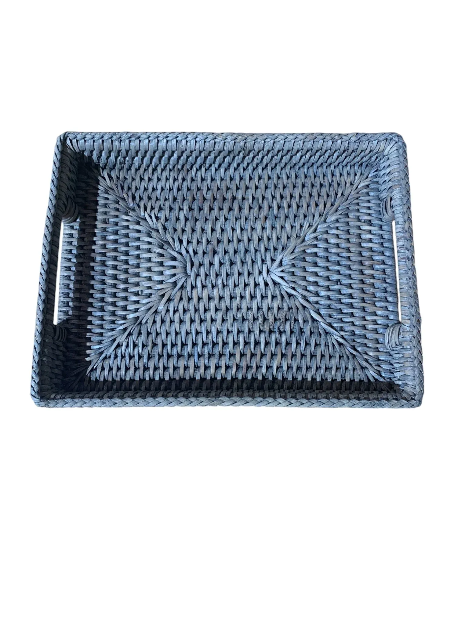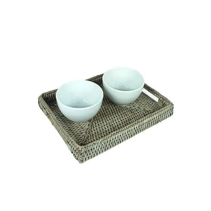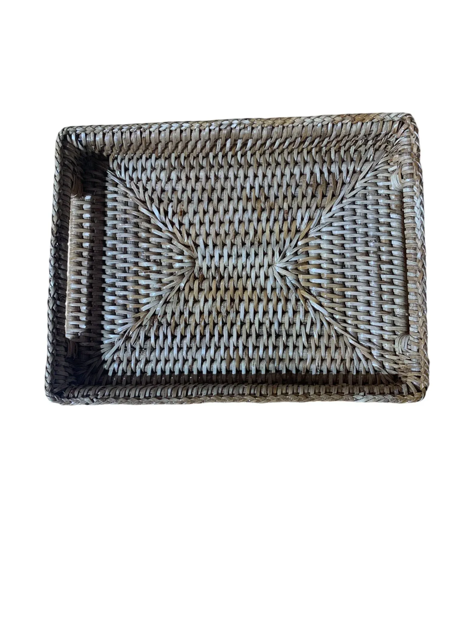 Preciosa bandeja rectangular pequeña fabricada en ratán de varios colores.