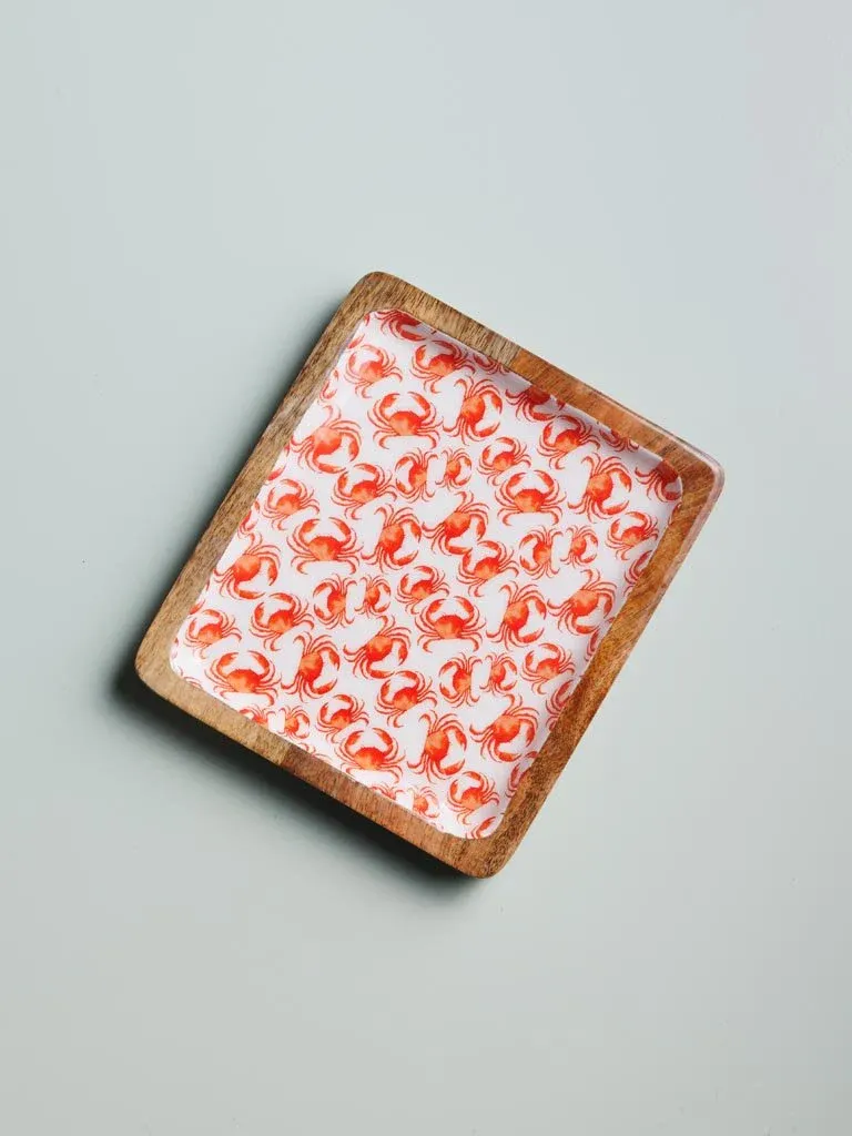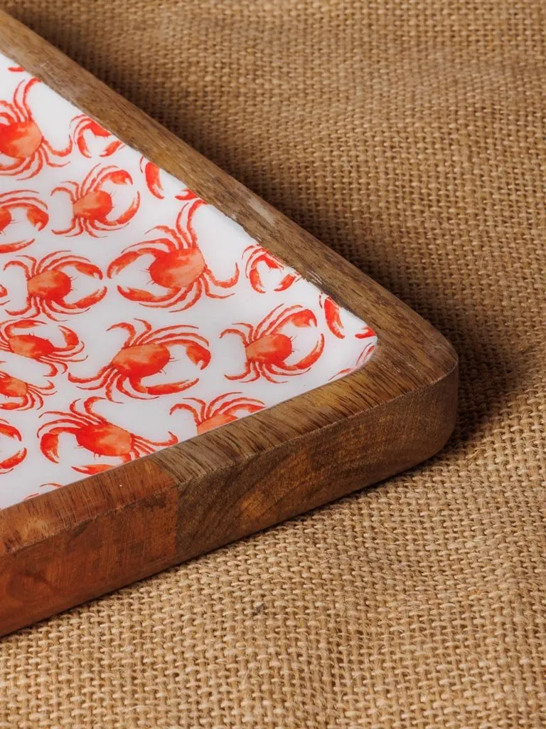 Preciosa bandeja rectangular fabricada en madera de mango con su interior esmaltado en color rojo y blanco con dibujos de cangrejos.
