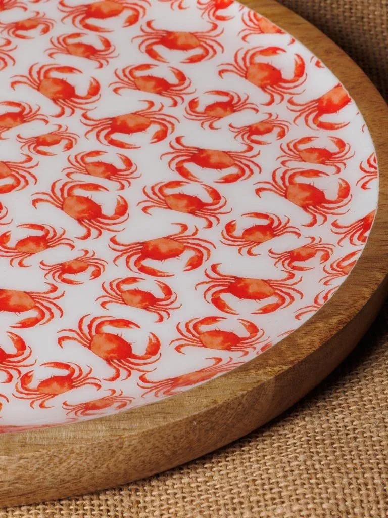 Preciosa bandeja fabricada en madera de mango color natural y en su interior con dibujos de cangrejos esmaltada en blanco y rojo.