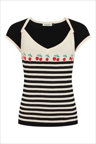 Jersey de punto mixto de viscosa con manga corta, raya en contraste y punto de intarsia color cereza.