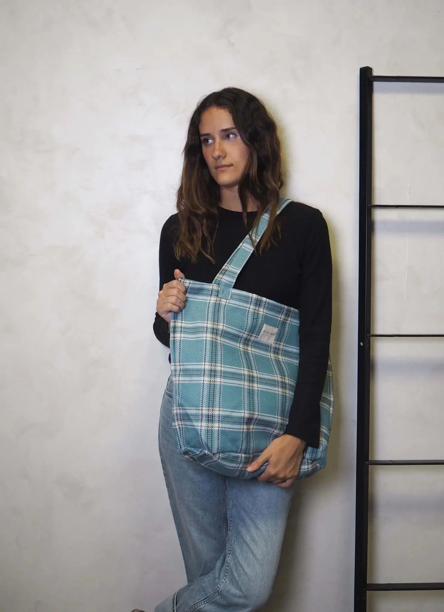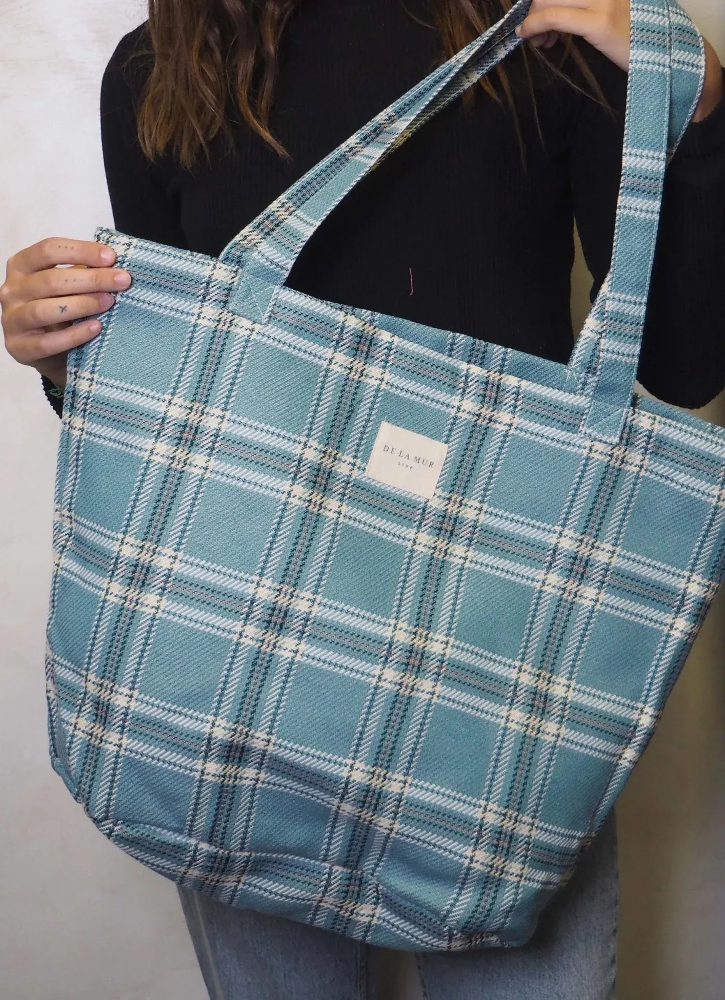 Bolsa shopper grande con asas para llevar al hombro. Con tejido de cuadros de color turquesa. Para su correcto mantenimiento se aconseja lavarlo en frío y no utilizar secadora.