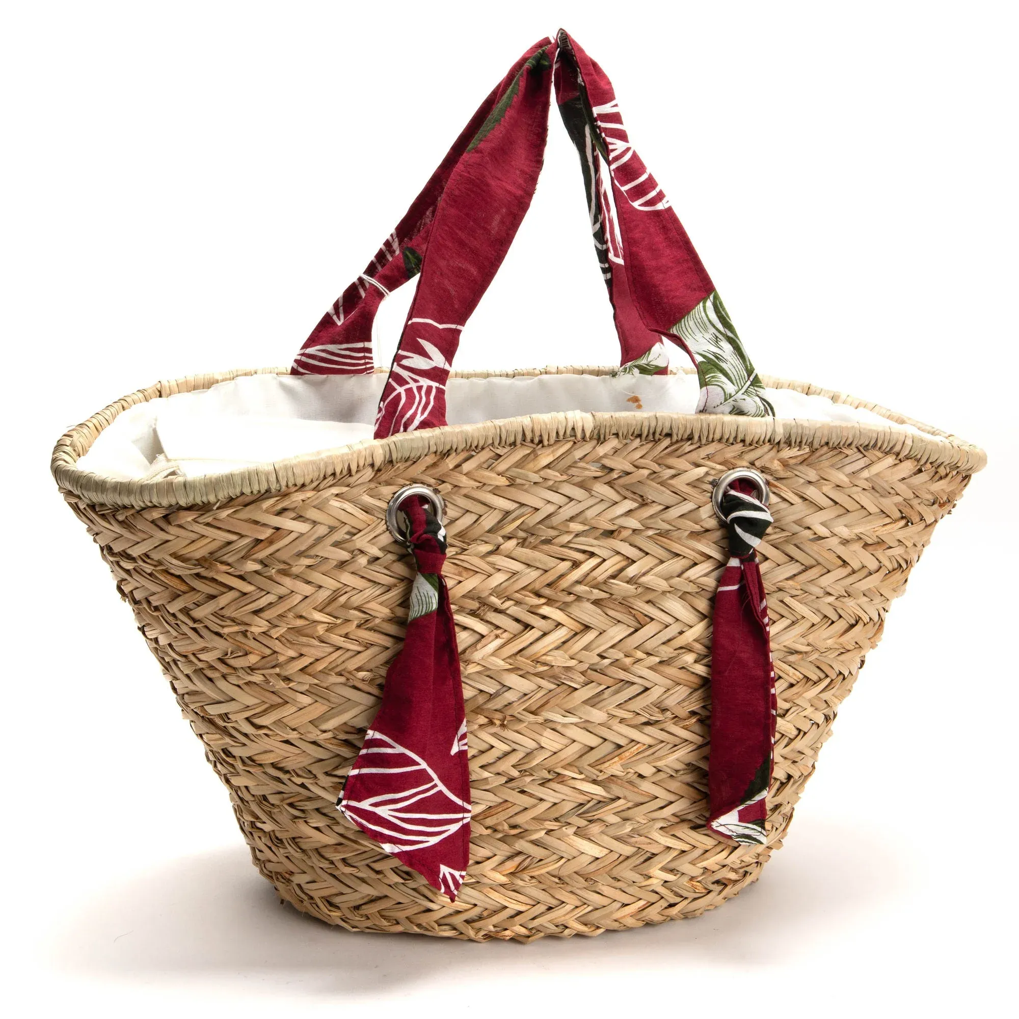 Precioso bolso capazo fabricado en fibras naturales color natural y asas en tela color rojo o amarillo.