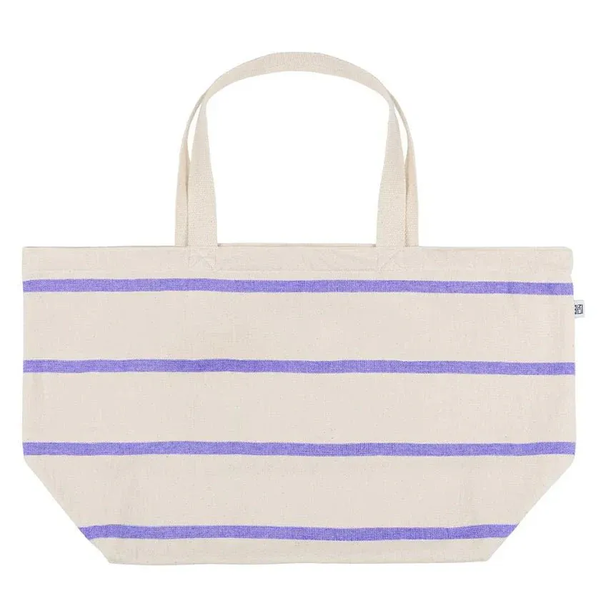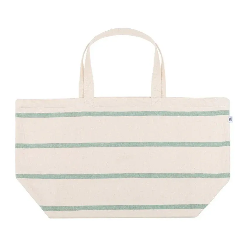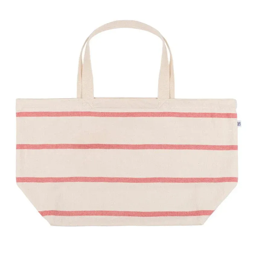 Bolso de playa con rayas anchas en color crudo y finas de varios colores. Se inspira en el faro de Boa-Nova, en Leça da Palmeira, el segundo faro más grande en Portugal.