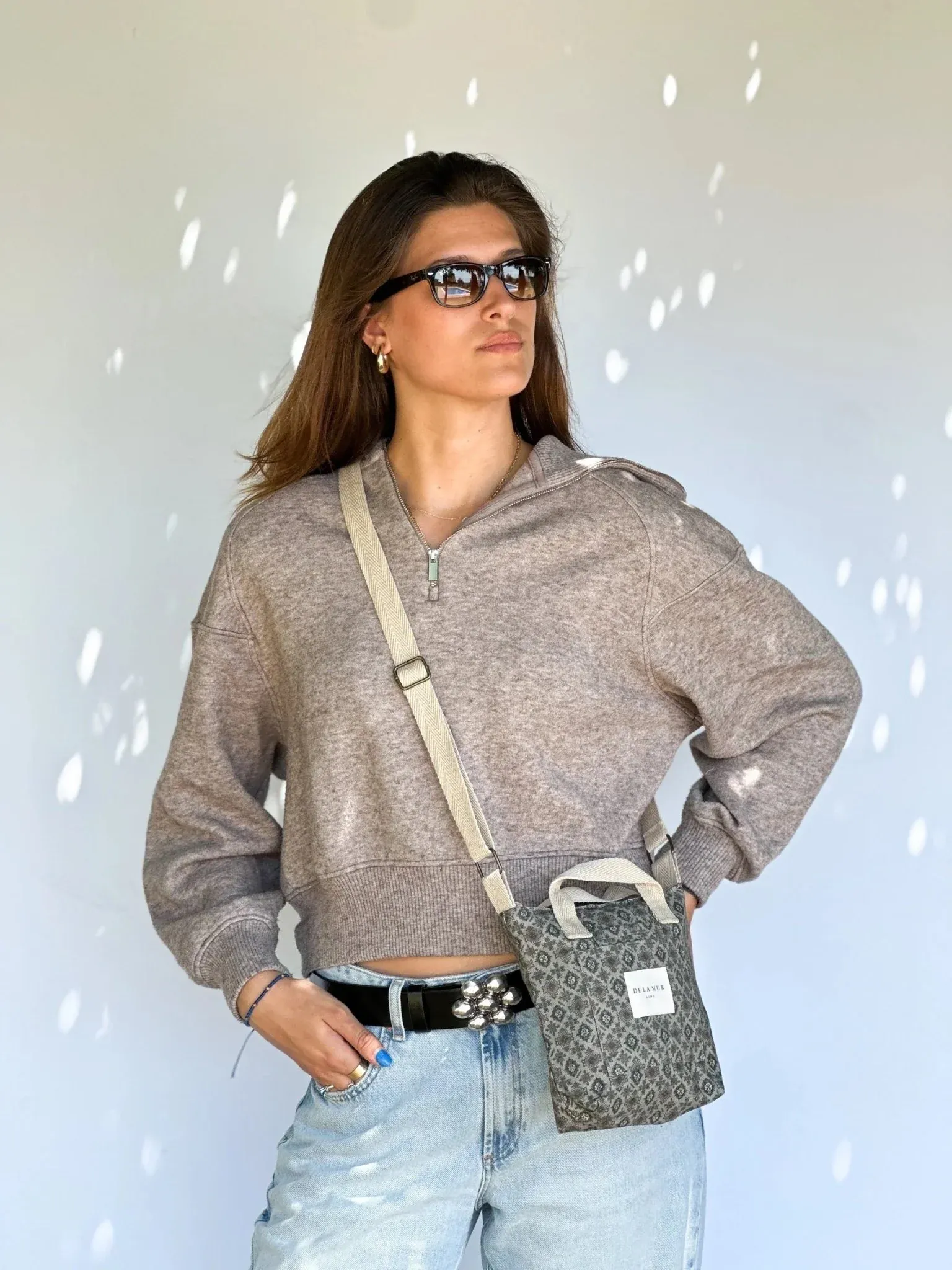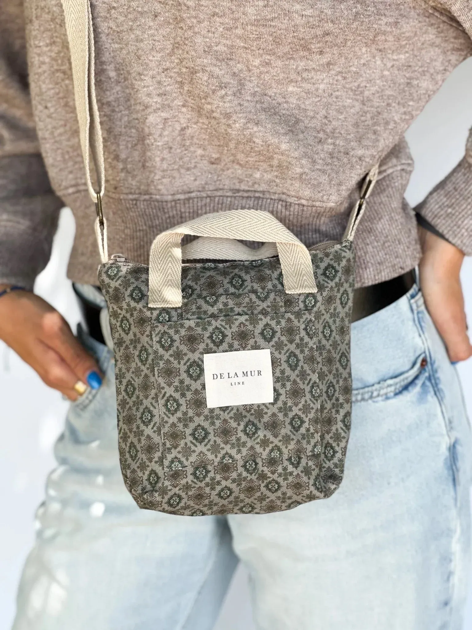 Bolso mini tipo bandolera con asas pequeñas en la parte superior y asa larga ajustable de cinta de espiga de algodón de color beige. Bolsillos sin cremallera en la parte exterior. Con tejido fino con estampado geométrico de color verde caqui. Cierre superior con cremallera. Forrado de tejido grueso de color gris en la parte interior. Bolsillo interior con cremallera. Para su correcto mantenimiento se aconseja lavarlo en frío a mano y no utilizar secadora.