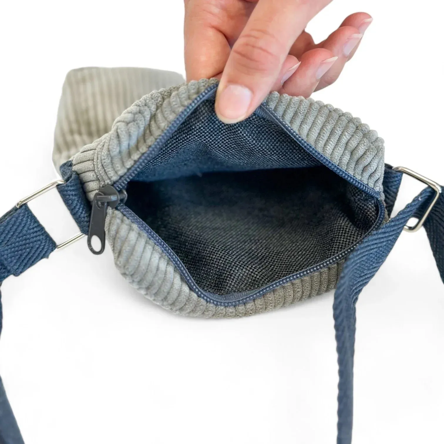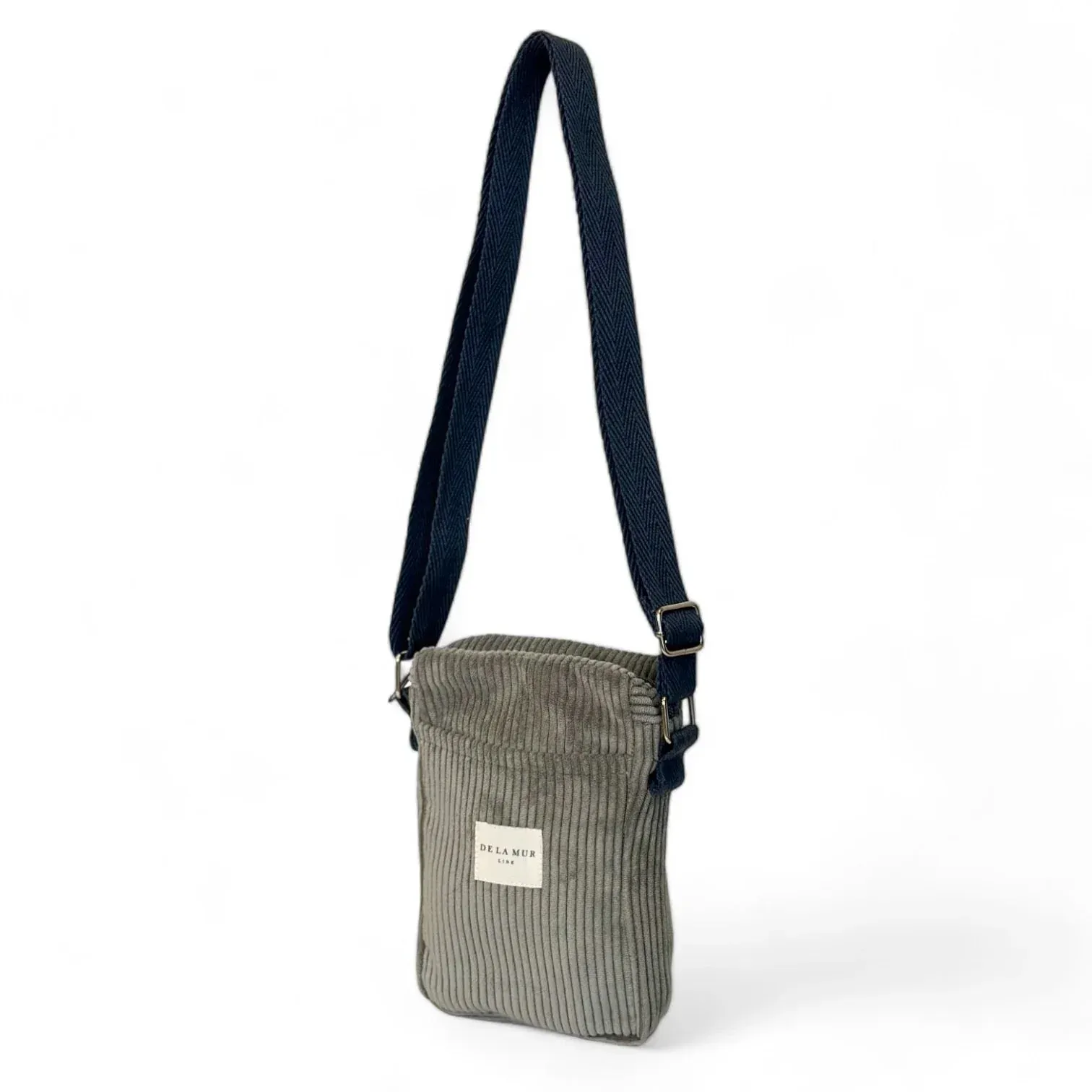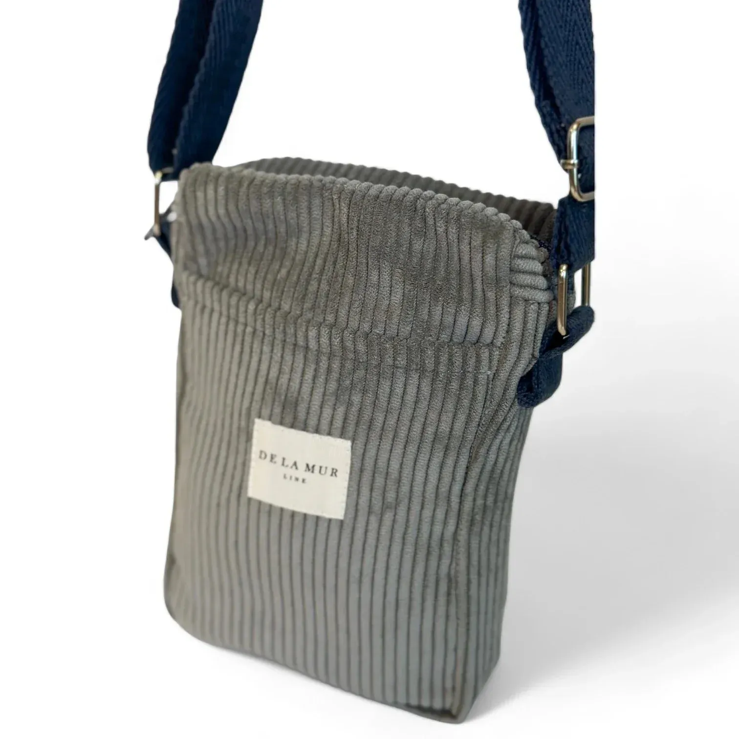 Bolso porta móvil para llevar tipo bandolera, con cremallera en la parte superior y asa larga ajustable de cinta de espiga de algodón de color negro. Bolsillo sin cremallera en la parte exterior. Con tejido grueso de pana azul, gris, rosa y marrón. Forrado de tejido grueso de color gris en la parte interior. Para su correcto mantenimiento se aconseja lavarlo en frío a mano y no utilizar secadora.