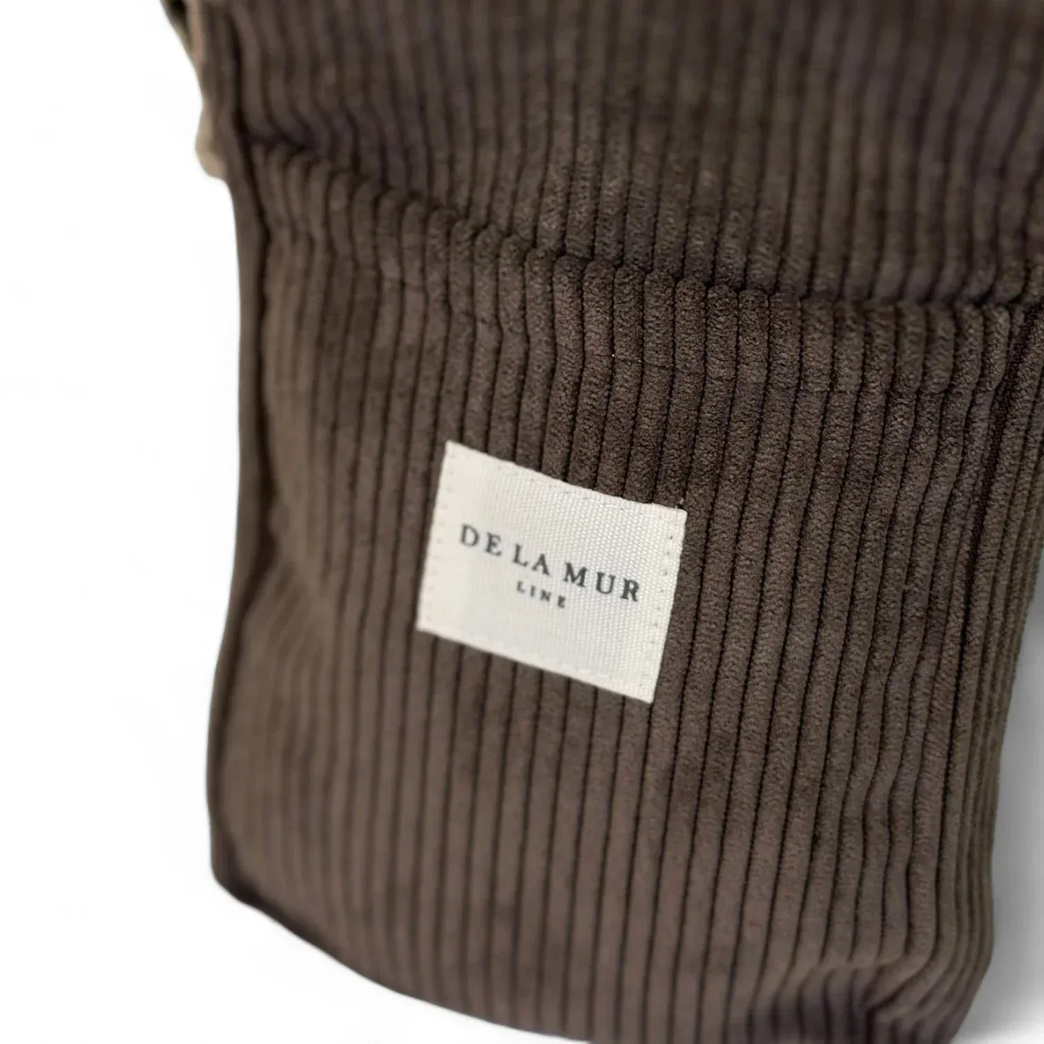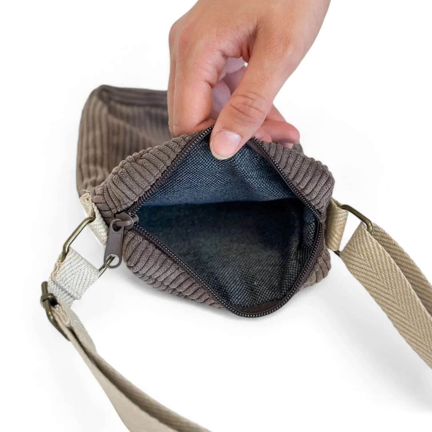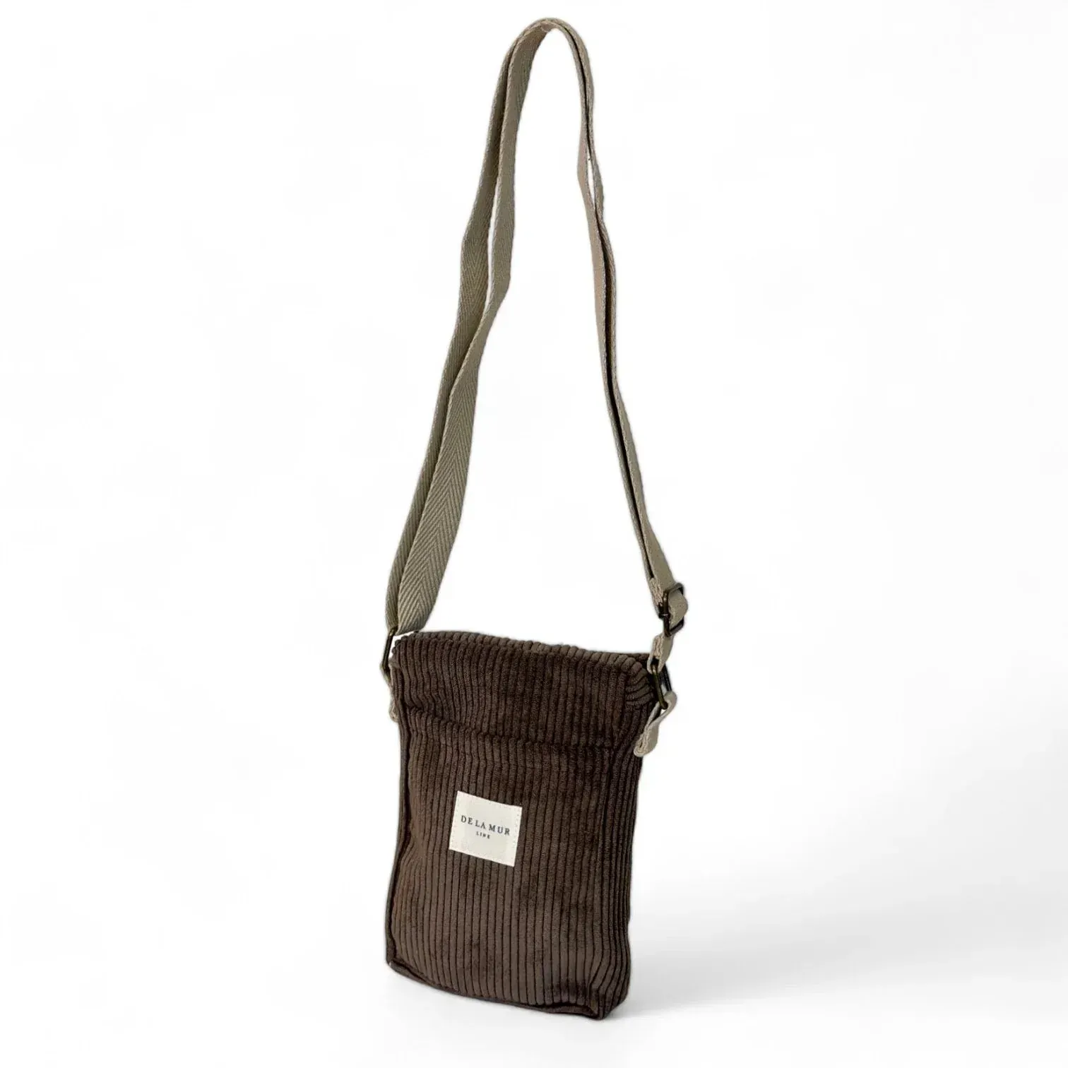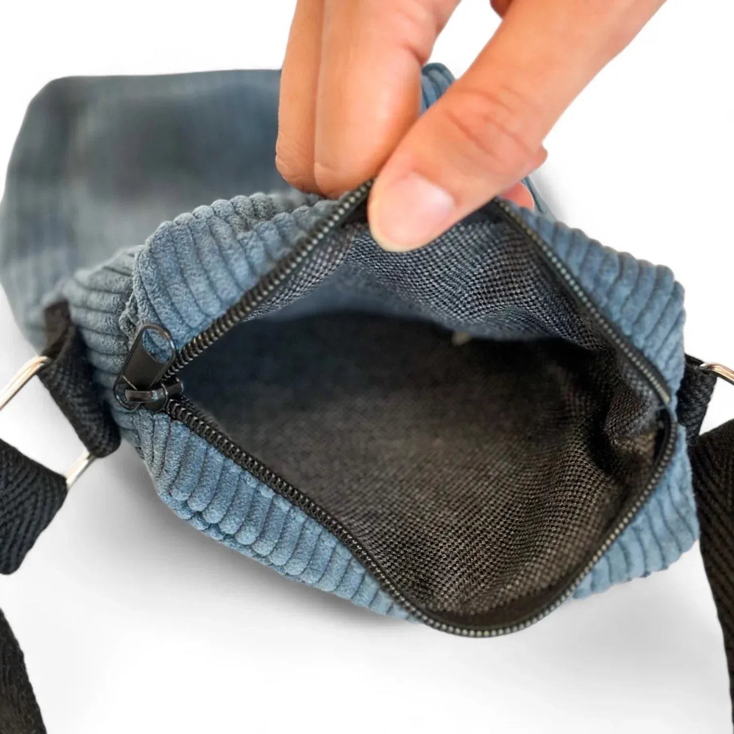 Bolso porta móvil para llevar tipo bandolera, con cremallera en la parte superior y asa larga ajustable de cinta de espiga de algodón de color negro. Bolsillo sin cremallera en la parte exterior. Con tejido grueso de pana azul, gris, rosa y marrón. Forrado de tejido grueso de color gris en la parte interior. Para su correcto mantenimiento se aconseja lavarlo en frío a mano y no utilizar secadora.