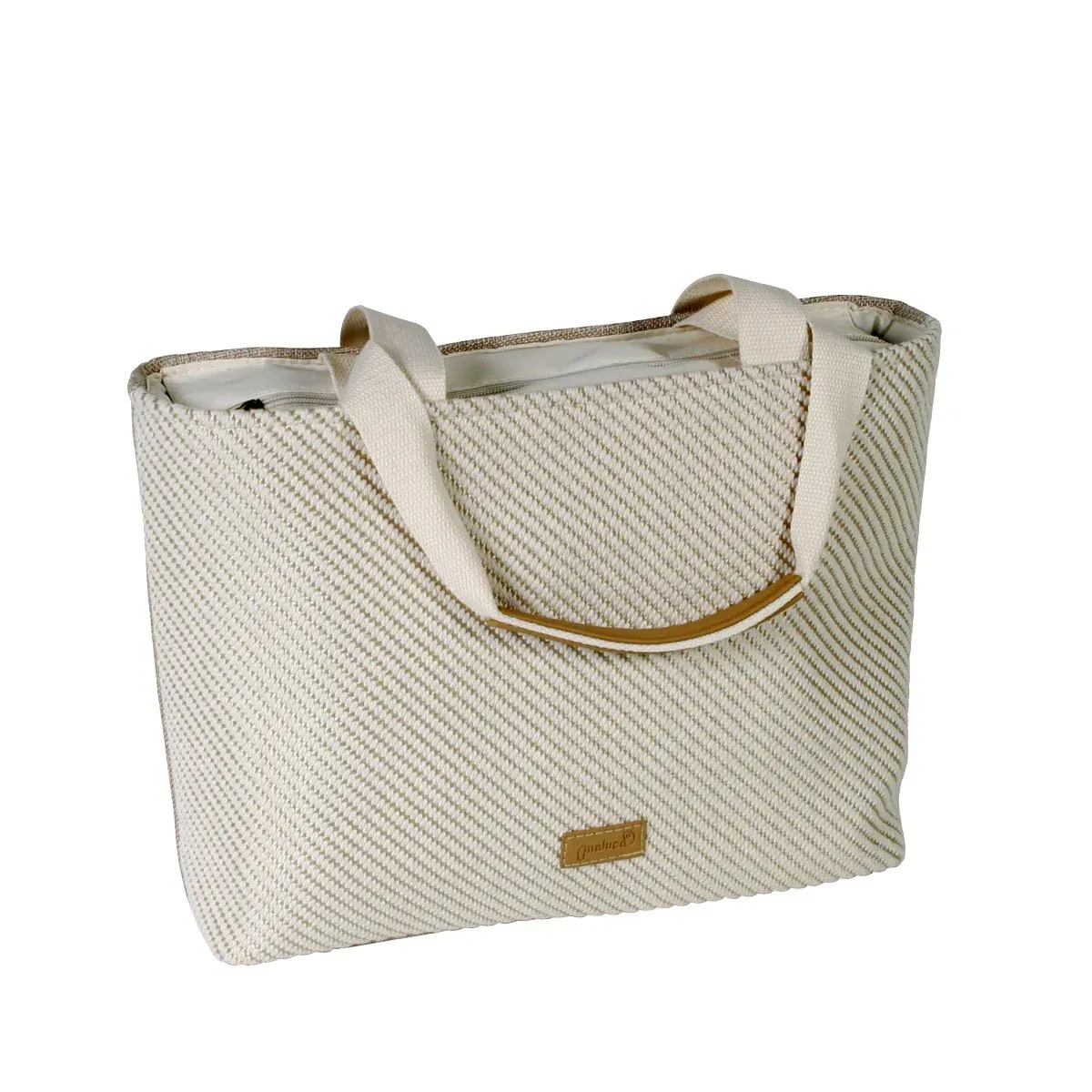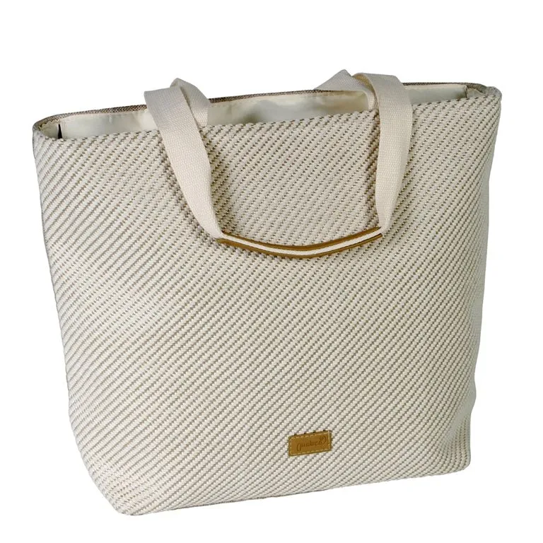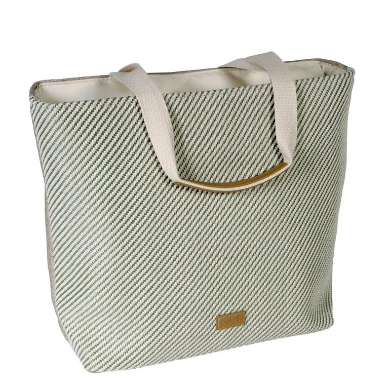 Precioso bolso fabricado en tela con cierre de cremallera con dibujo de rayas en color beige y kaki. Disponible en dos medidas.