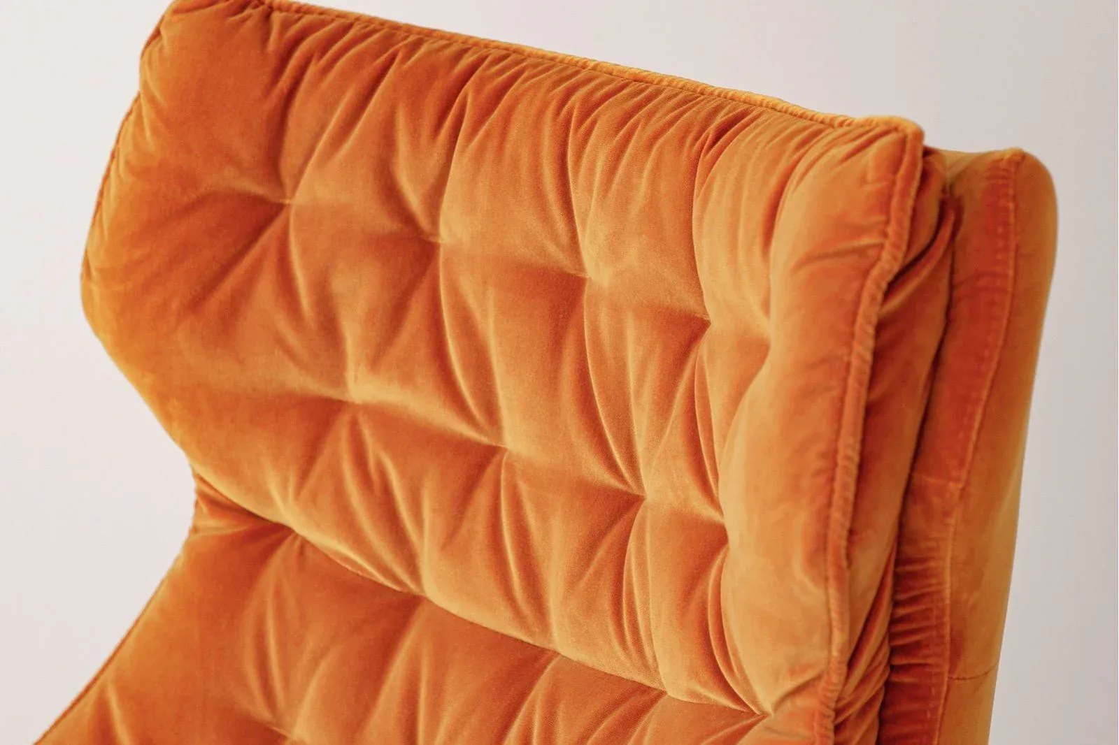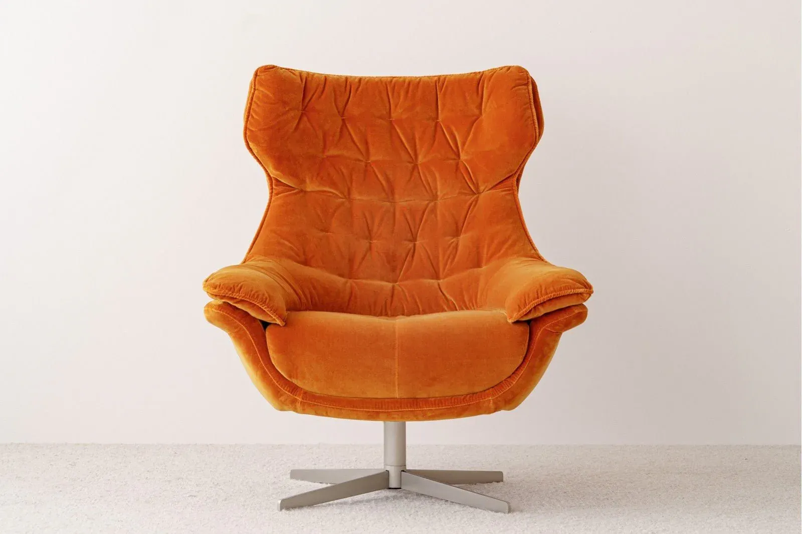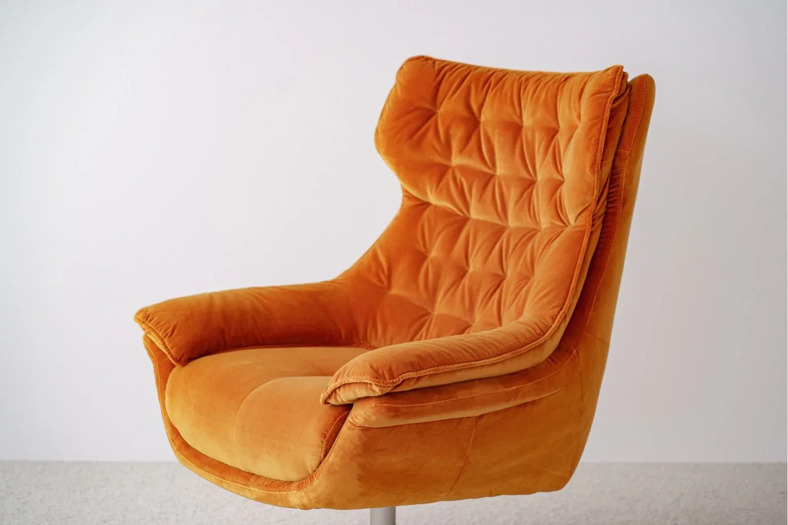 Butaca de diseño giratoria con pie de acero tapizada en terciopelo de color naranja, tejido 100% poliéster, una butaca con un diseño sencillo y cómodo por su formas mullidas. Un diseño cálido que combinará a la perfección en cualquier estancia. Las patas requieren montaje.