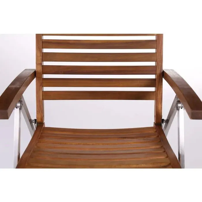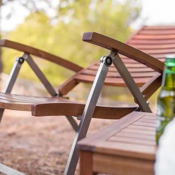 Preciosa butaca de 5 posiciones con bastidor y herrajes de acero inoxidable 18/10, respaldo alto realizado en madera de acacia.
