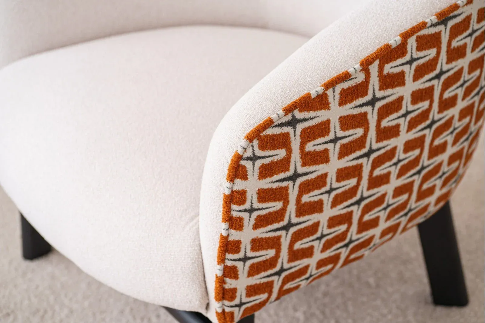 Butaca de estilo contemporáneo con doble tapizado 100% poliéster y patas en forma ovalada realizadas en madera maciza de roble en color negro, el color beige del interior contrata con el estampado geométrico exterior en tonos cálidos anaranjados y beige con toques en gris.