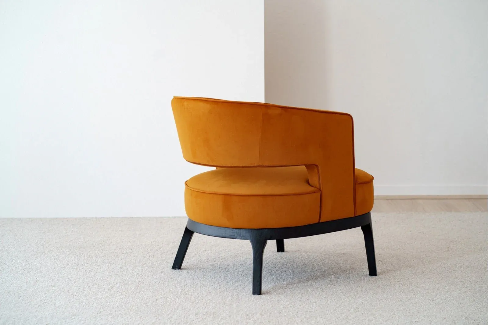 Butaca de estilo contemporáneo de forma redondeada tapizada en terciopelo en color mostaza oscuro y base en madera maciza de fresno en color negro.