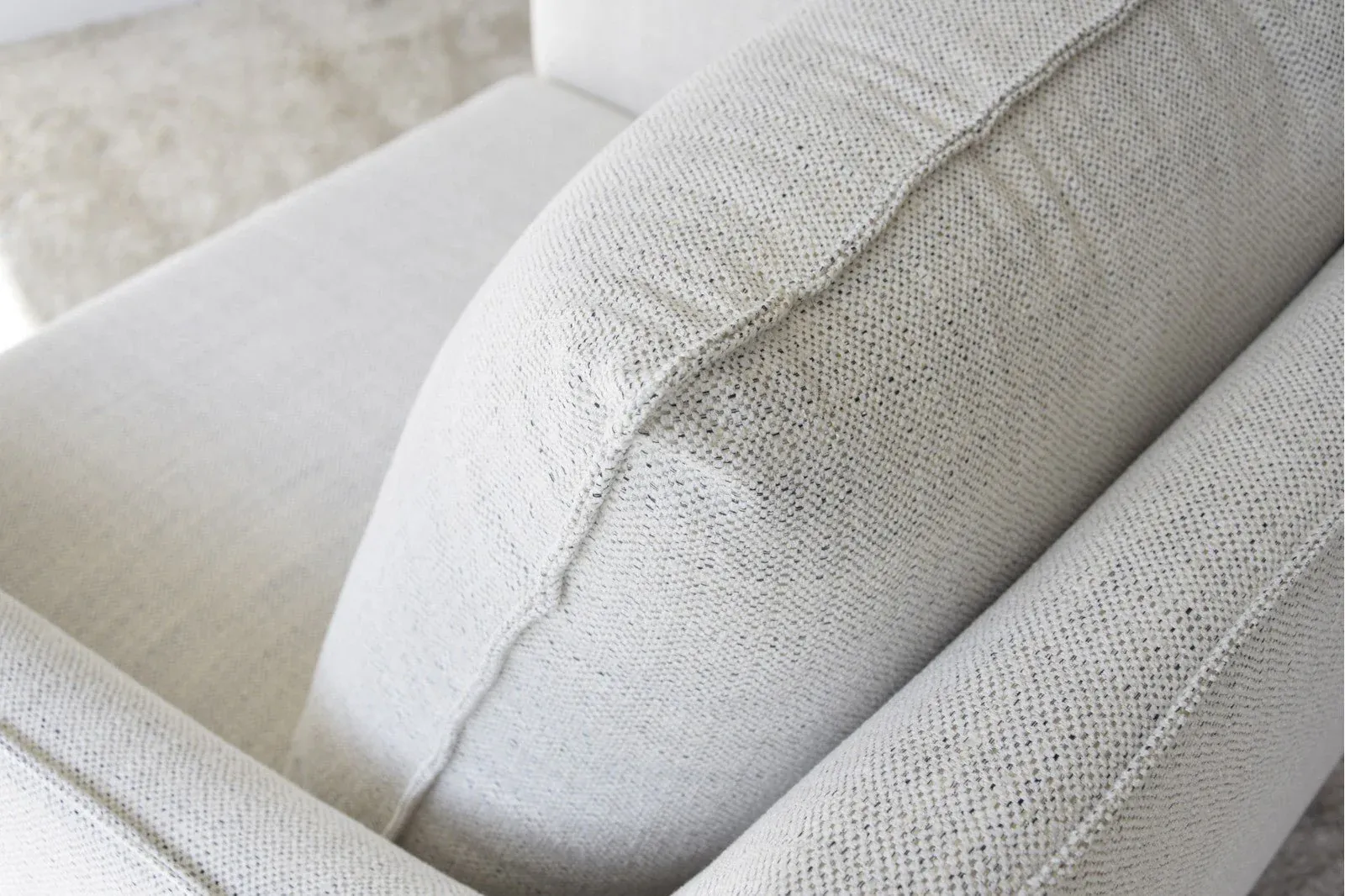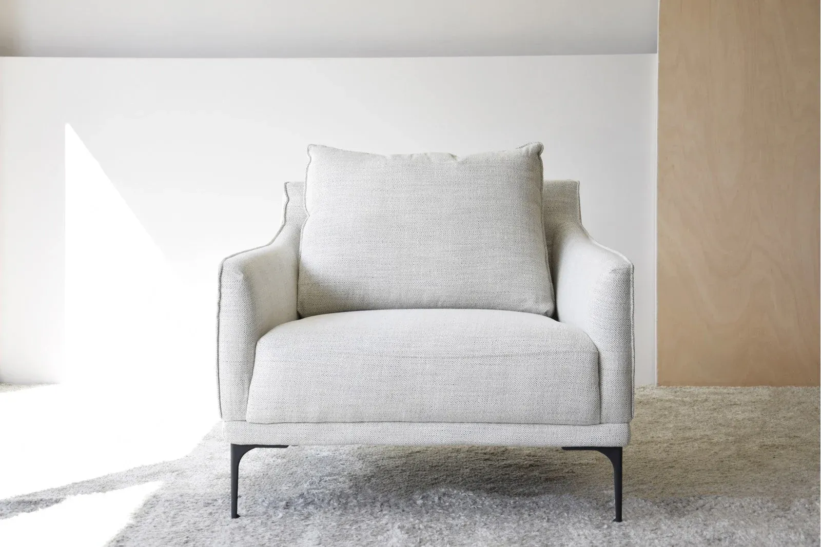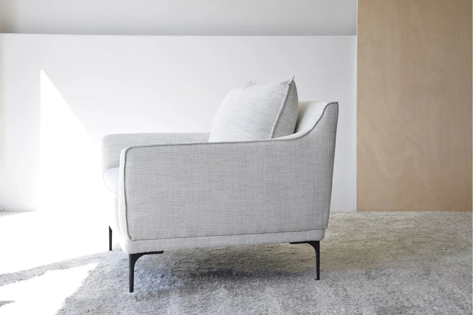 Butaca de forma cuadrada tapizada en tela 85% poliéster – 15 acrílico mezclilla tonos beige y patas metálicas en negro mate. Las patas requieren montaje.