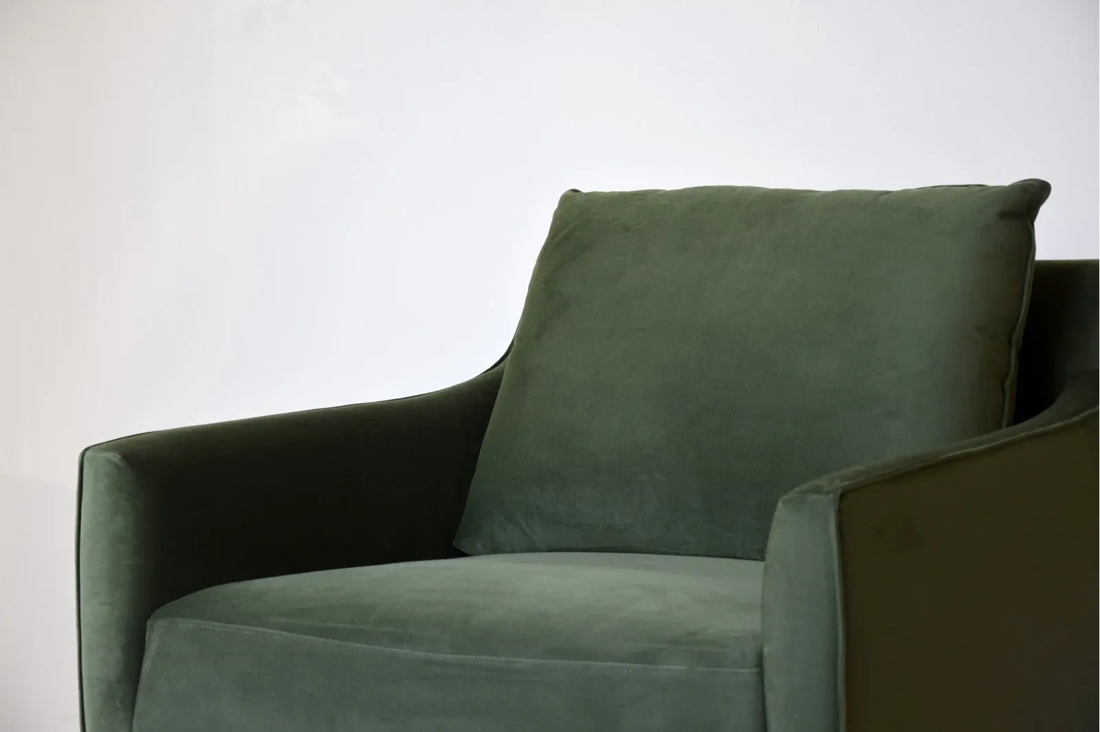 Preciosa butaca tapizada en terciopelo de color verde y patas metálicas en negro mate. Un diseño de formato cuadrado y estética mullida que invita al descanso y la relajación.