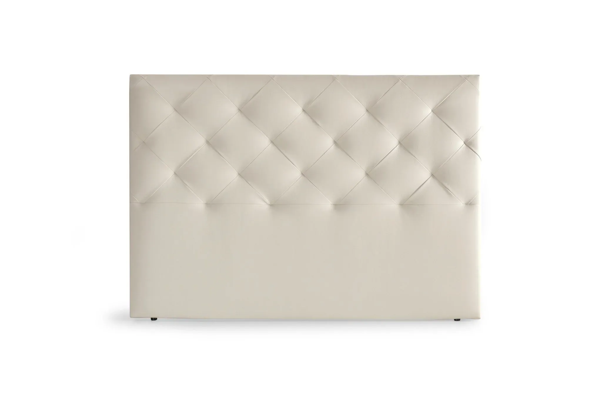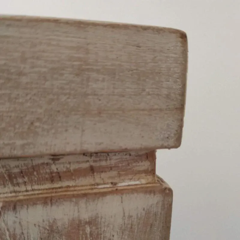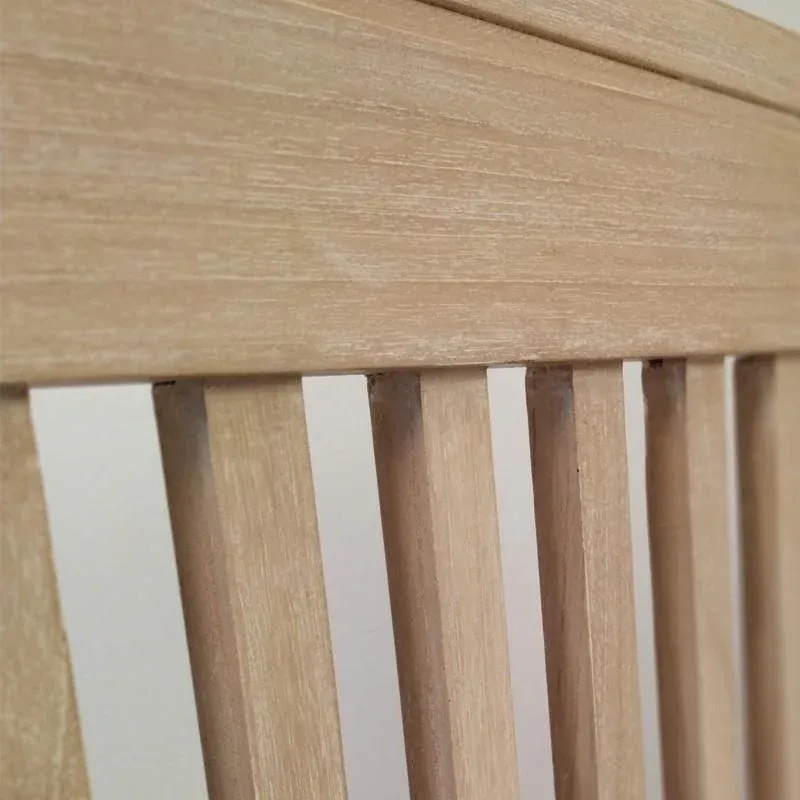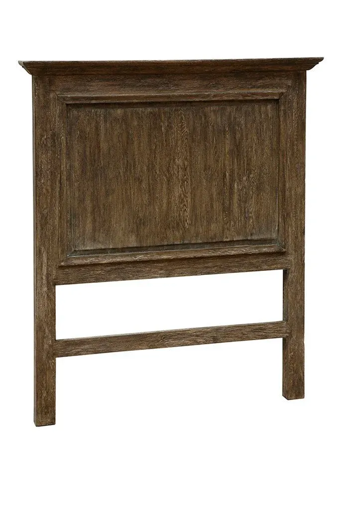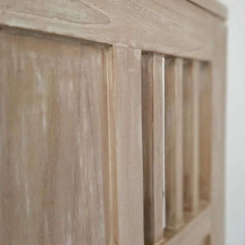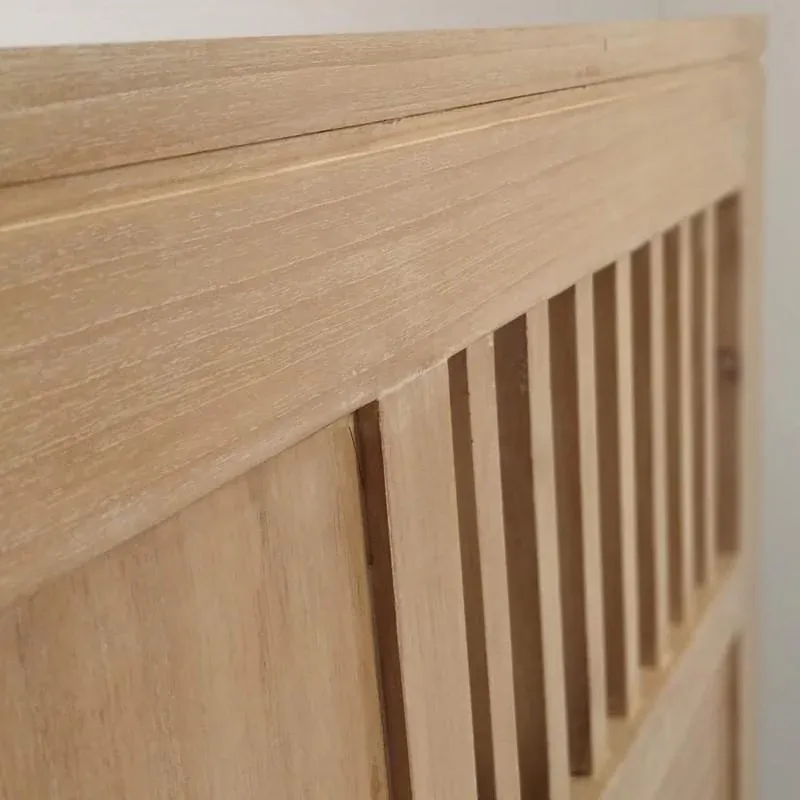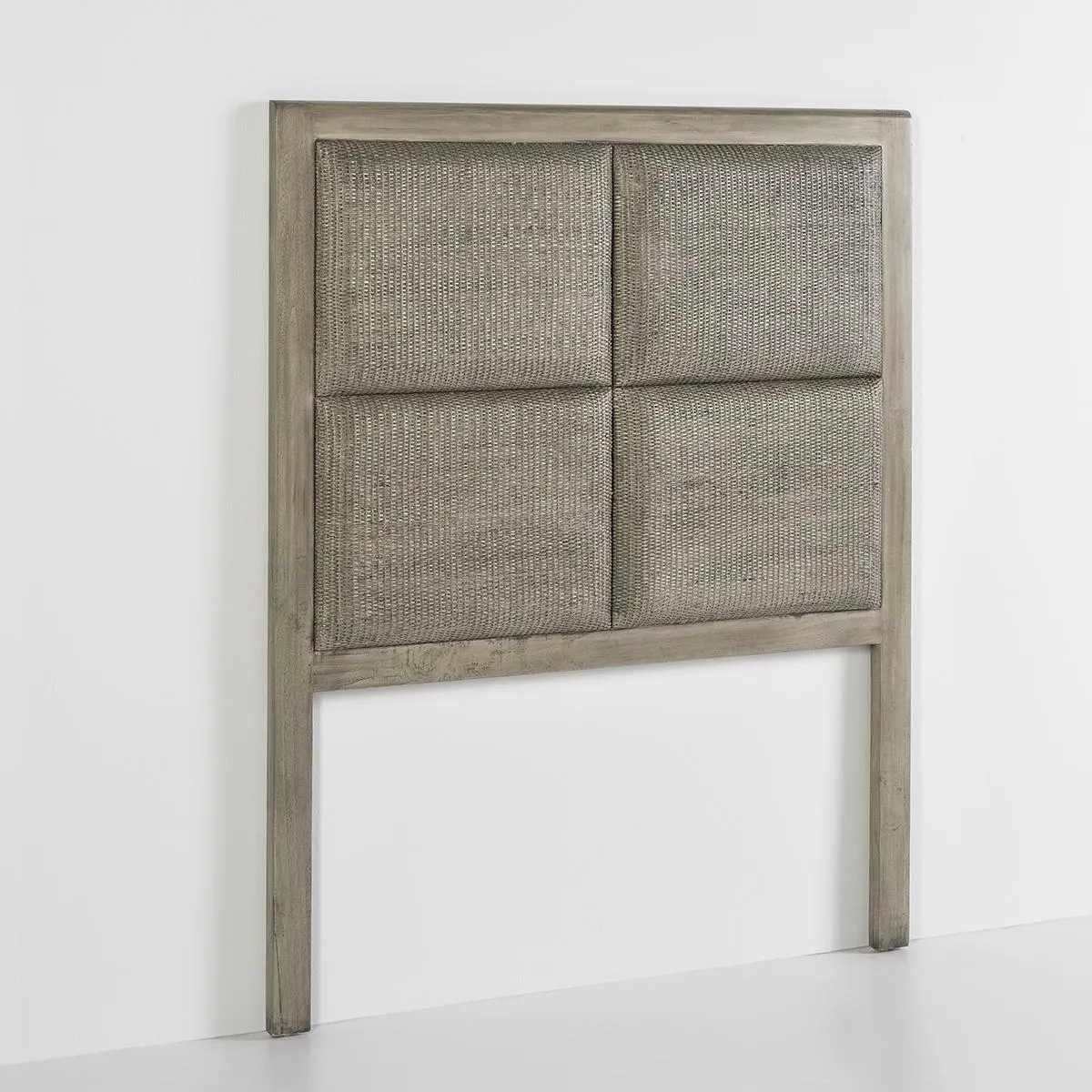 Cabecero de líneas rectas con detalle de barras de madera color natural patinado.