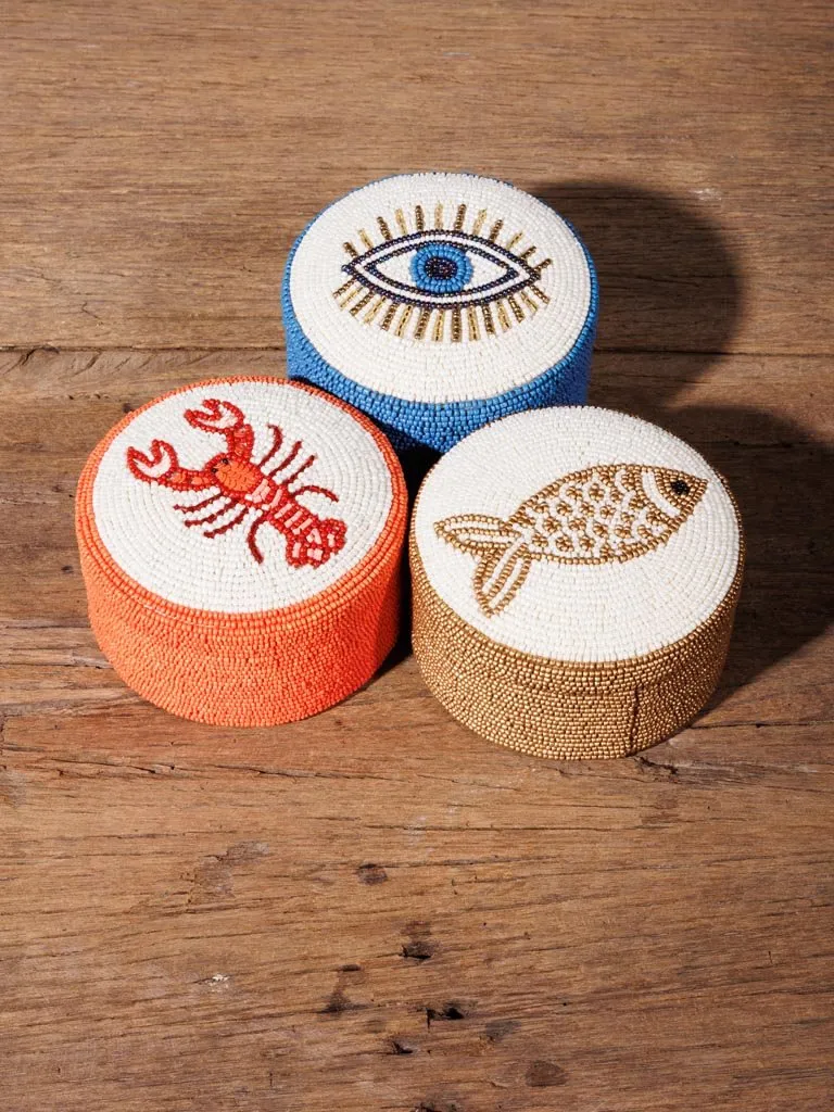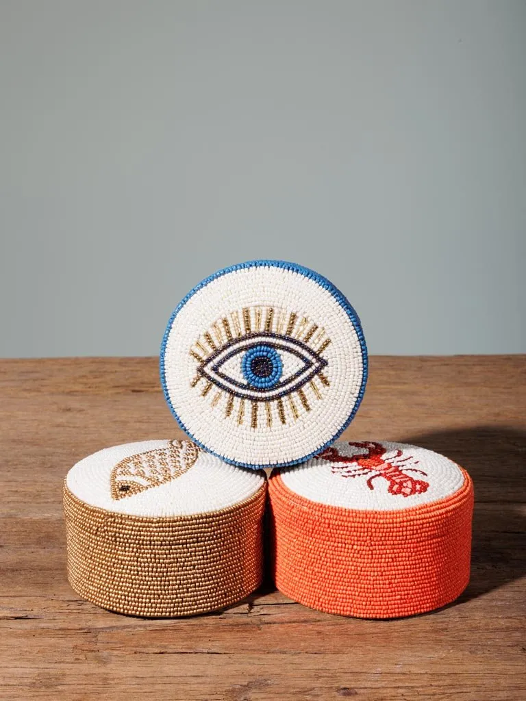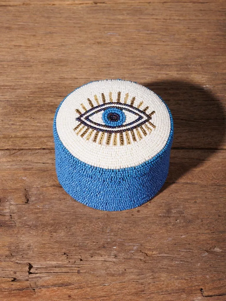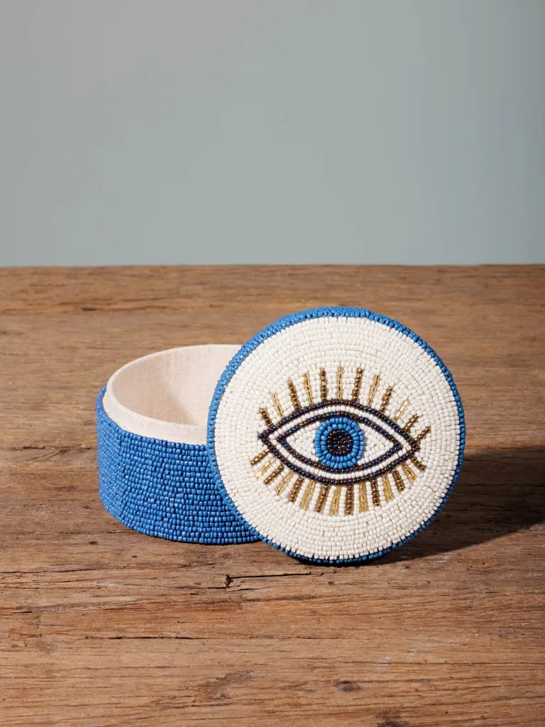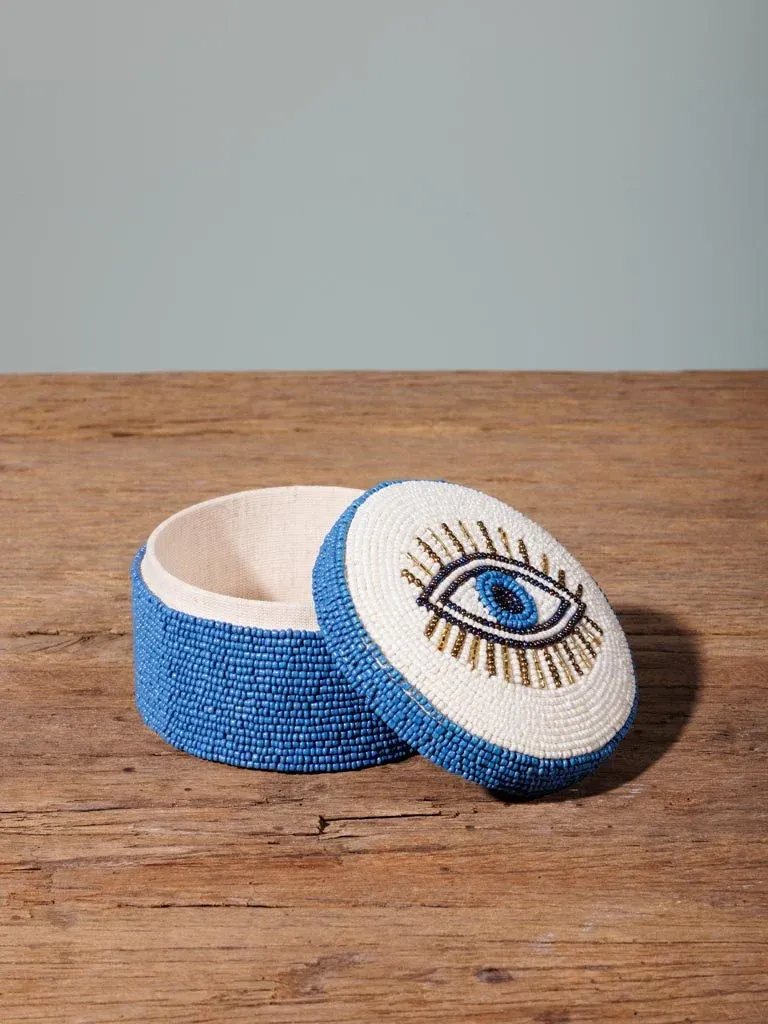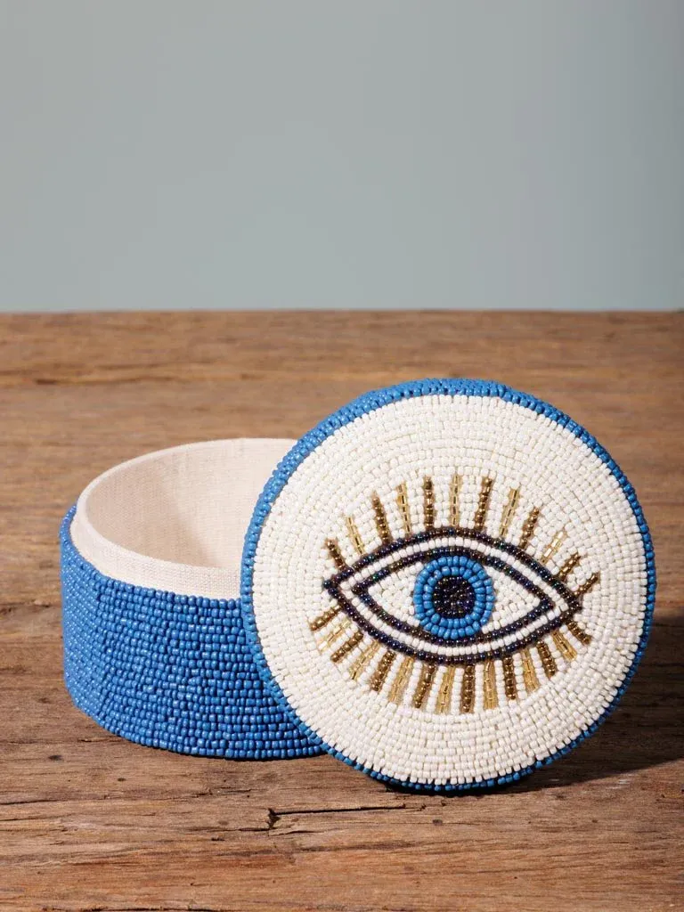 Preciosa caja redonda con dibujo de un ojo fabricado con cuentas en color azul y blanco.