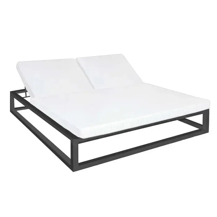 Elegante cama doble para exterior con respaldo reclinable de diseño moderno, con estructura de aluminio blanco y grafito con tapicería 100% de olefina. Disponibles en colores gris, marrón y blanco.
