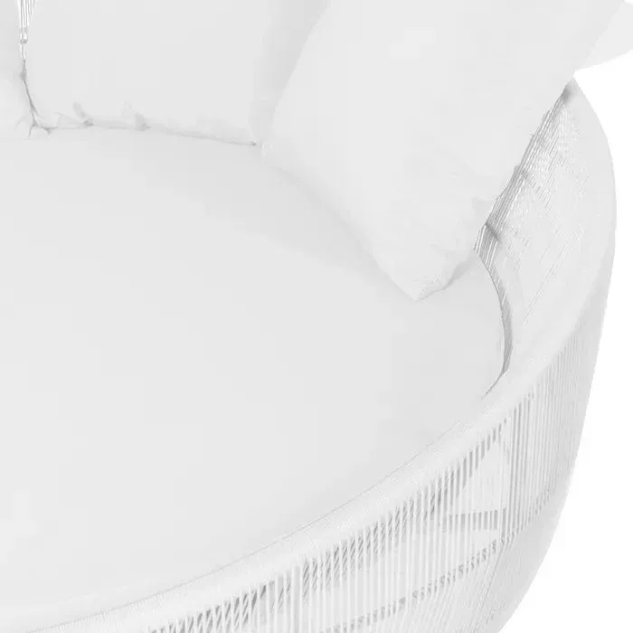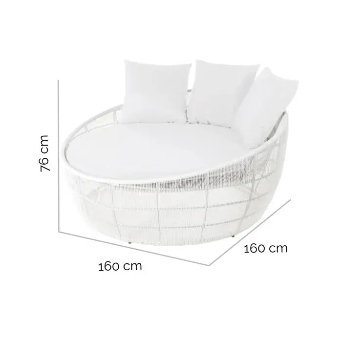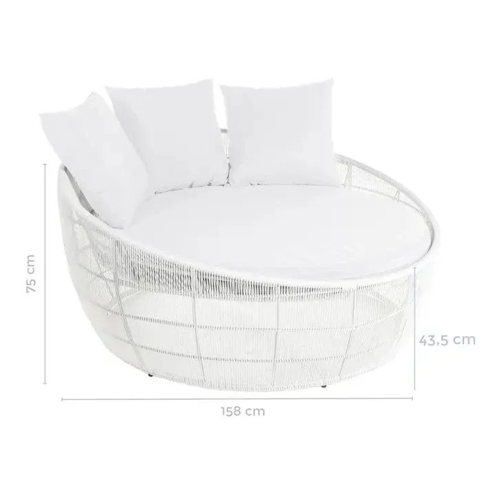 Cama redonda para exterior fabricada en acero y ratán sintético de color blanco y negro. Colchón de 7 cm desenfundable, incluye 3 cojines.