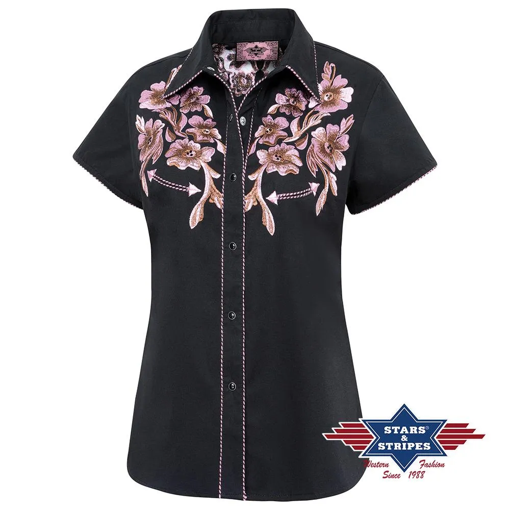 Preciosa blusa western de manga corta con elegantes bordados en el pecho y la espalda. Con ribetes bicolores y originales botones a presión cuadrados.