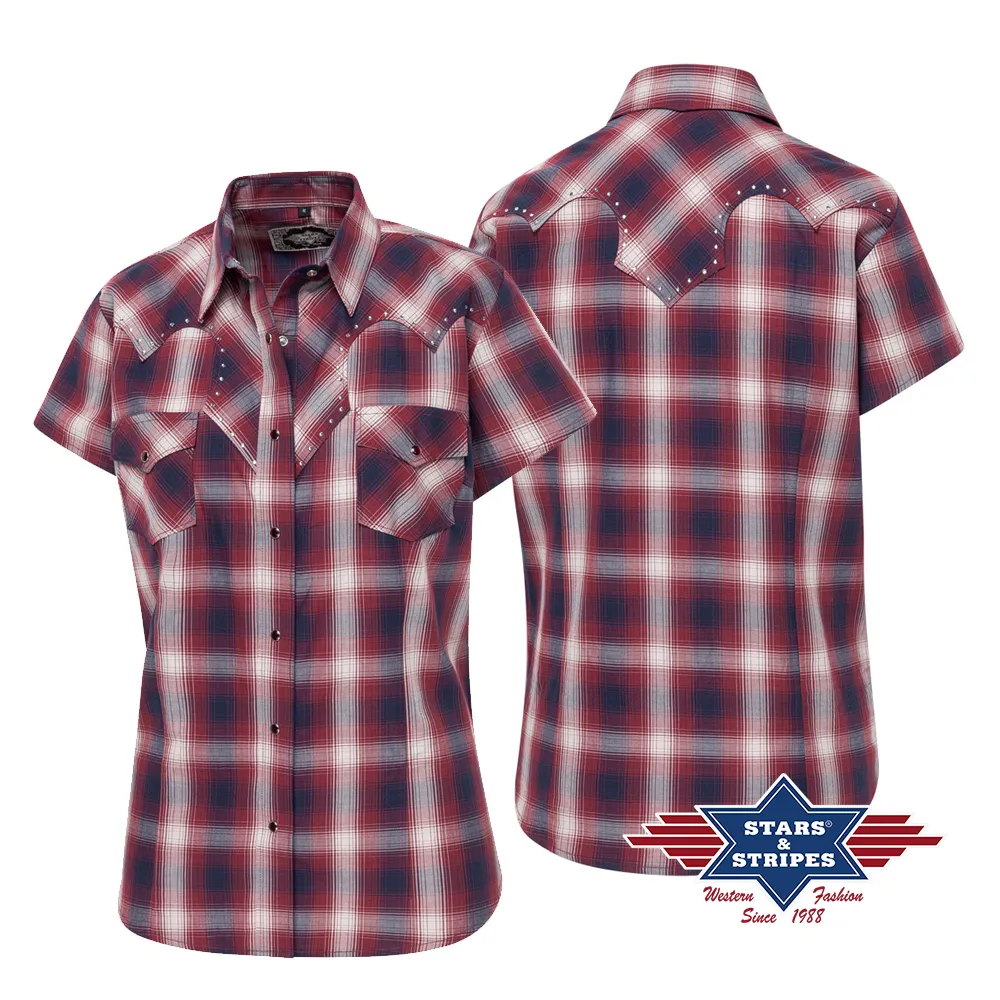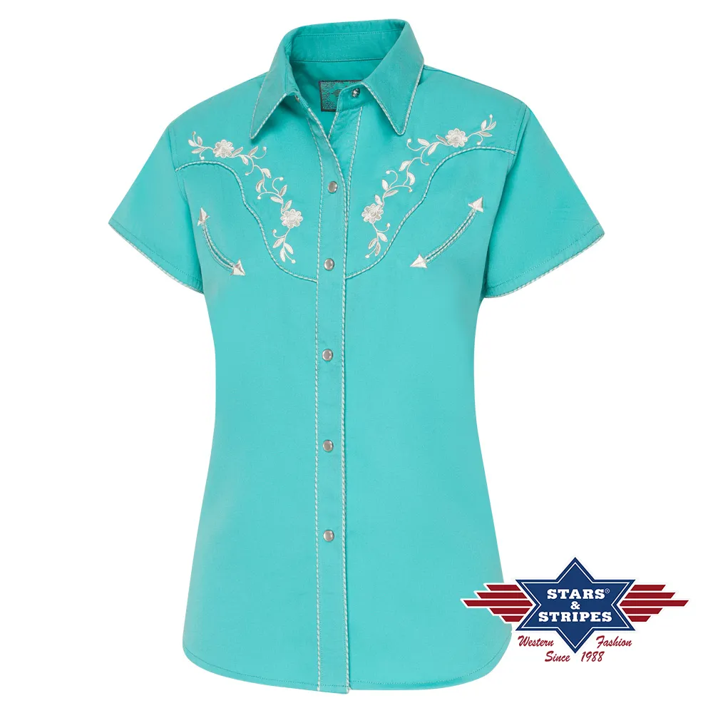 Camisa western Janice Elegante blusa estilo western con estupendos bordados en pecho, espalda y puños. La tira de botones está realzada con un ribete de cordón. Los emoticones falsos y los puños de cinco botones reflejan la moda occidental clásica. La blusa combina una textura de fácil cuidado con un corte entallado que favorece la figura y añade un toque del salvaje oeste.