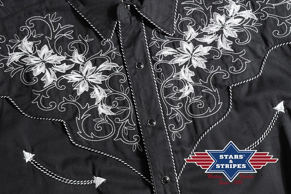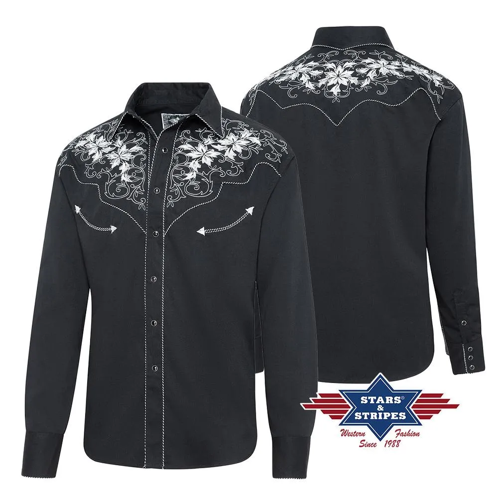 Exquisita camisa vaquera con gran bordado en pecho y espalda. Combina armoniosamente con ribetes de pana bicolor y puños con triple botonadura.