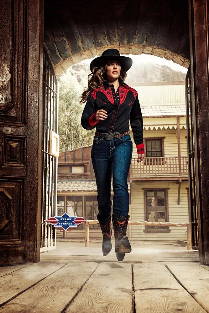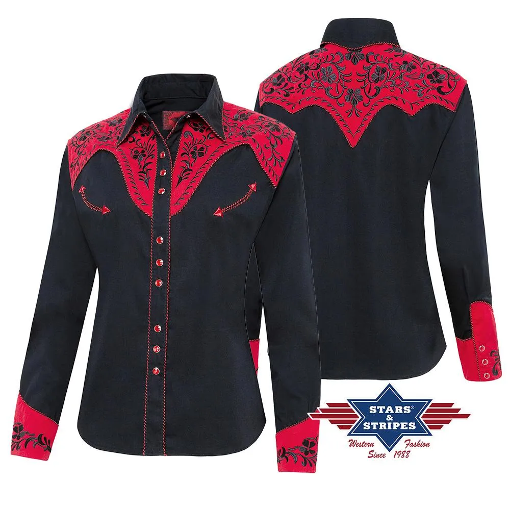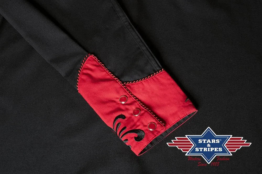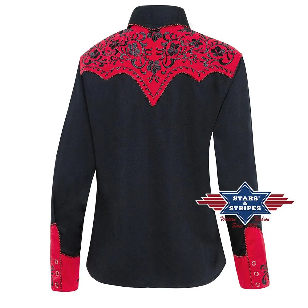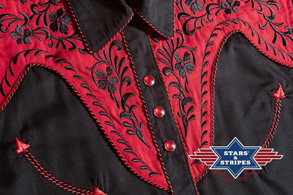 Exquisita blusa western negra con canesú western rojo con gran bordado en el pecho y espalda y en los puños rojos. Combina armoniosamente con ribetes de pana bicolor y puños con triple botonadura. Camisa de hombre a juego Brooks