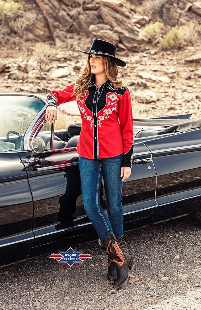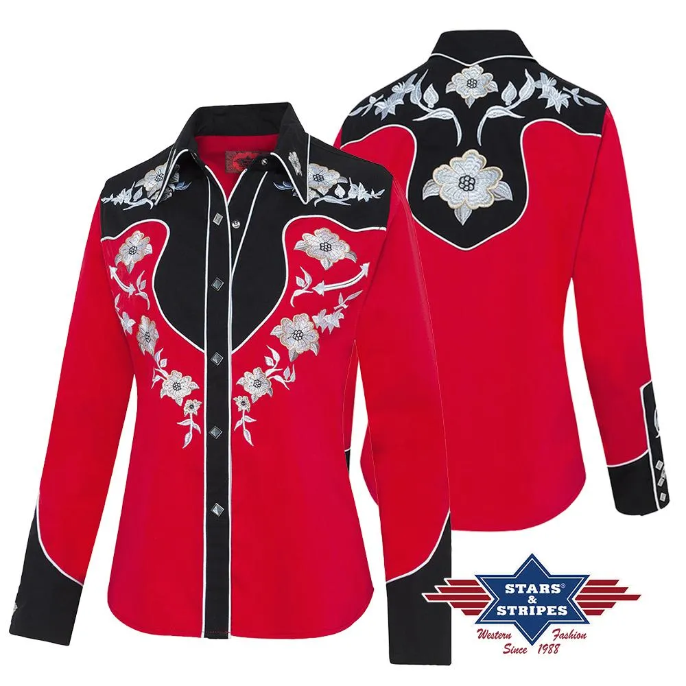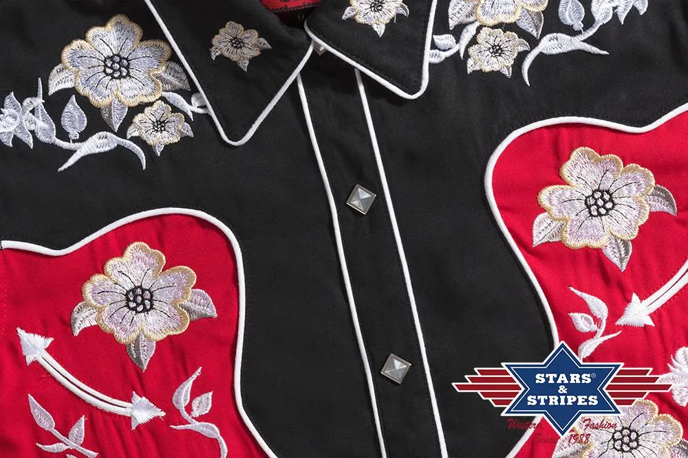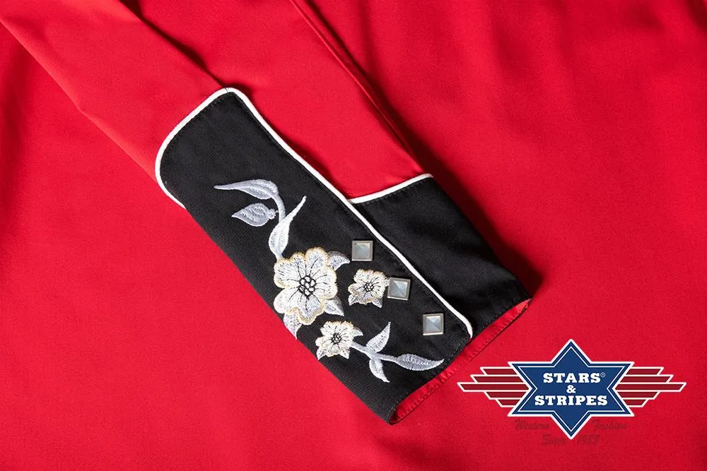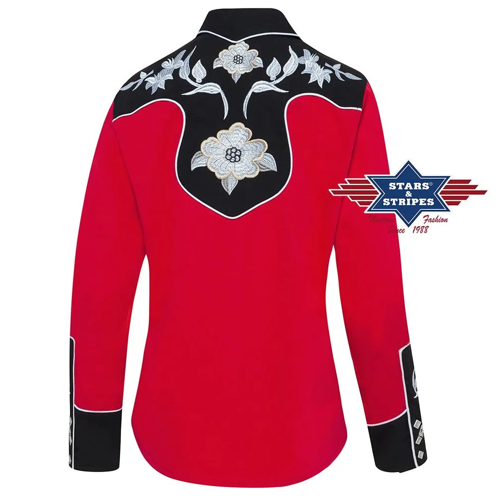 Exquisita blusa western roja con excepcional canesú western negro con gran bordado en el pecho y espalda y en los puños altos negros. Combina armoniosamente con ribetes blancos y puños con triple botonadura.