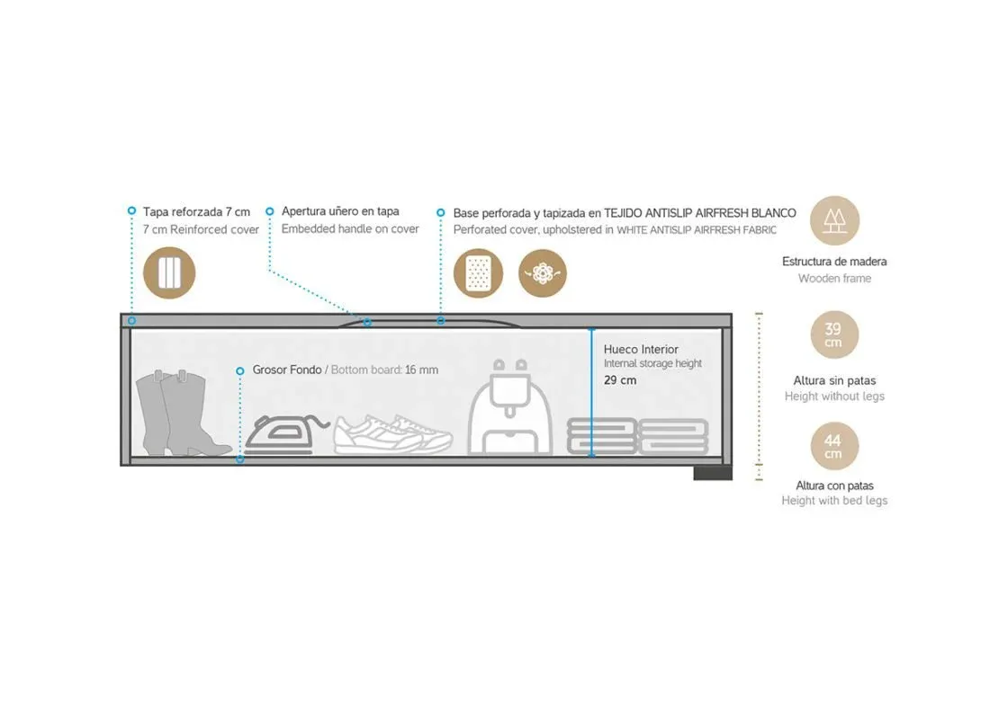 – Tipo B: Cajón dividido. Tapa de 1 pieza. Es el más vendido. Preferible para pisos y habitaciones donde sea conveniente meter el canapé desmontado.