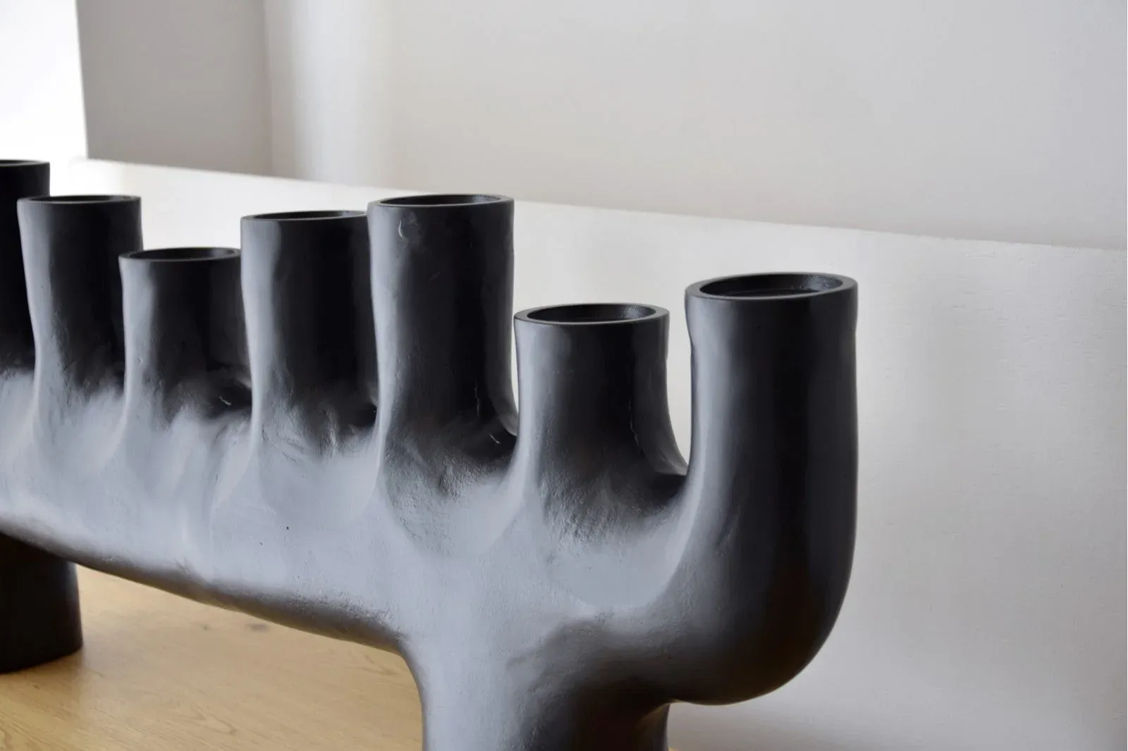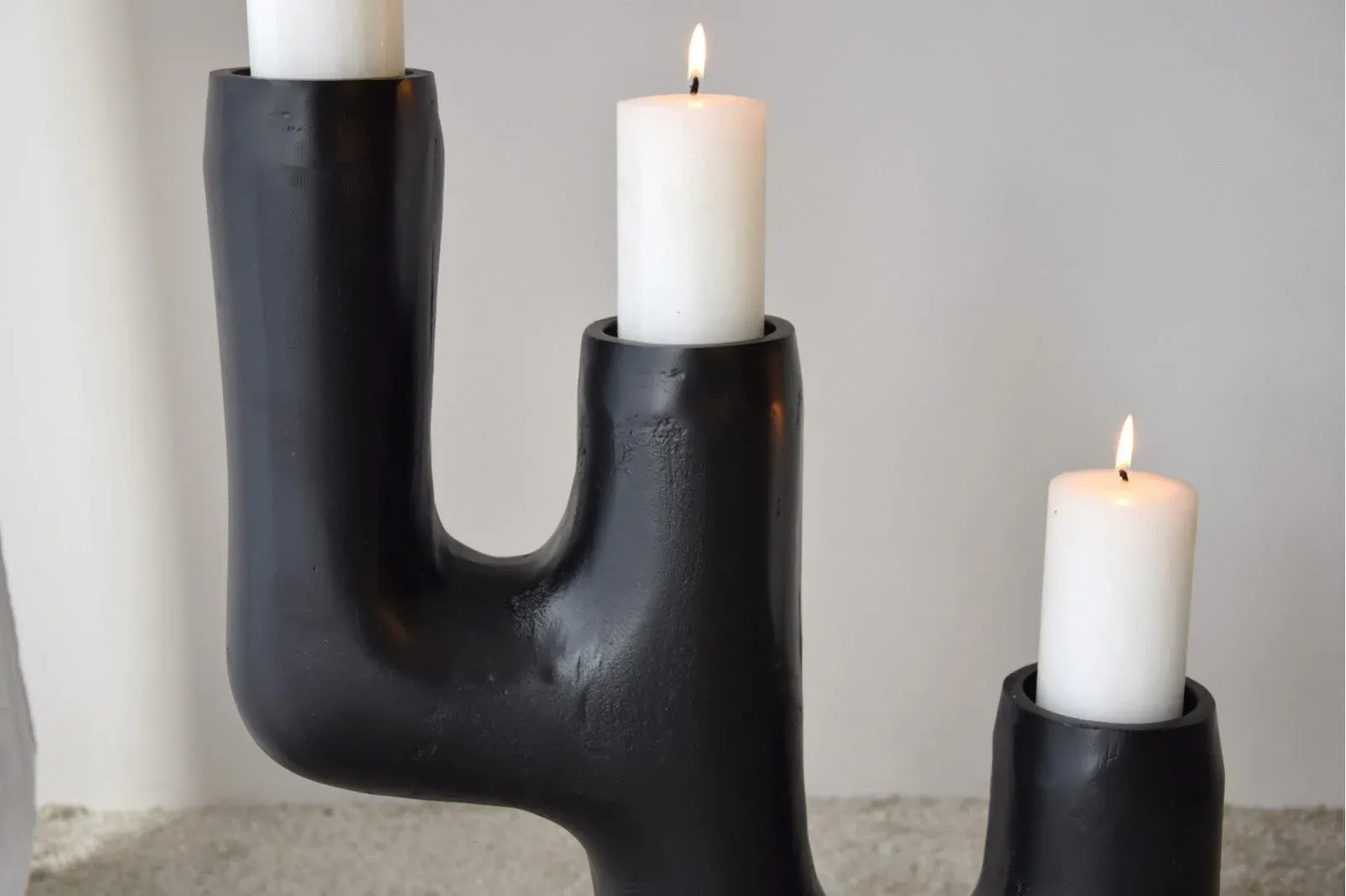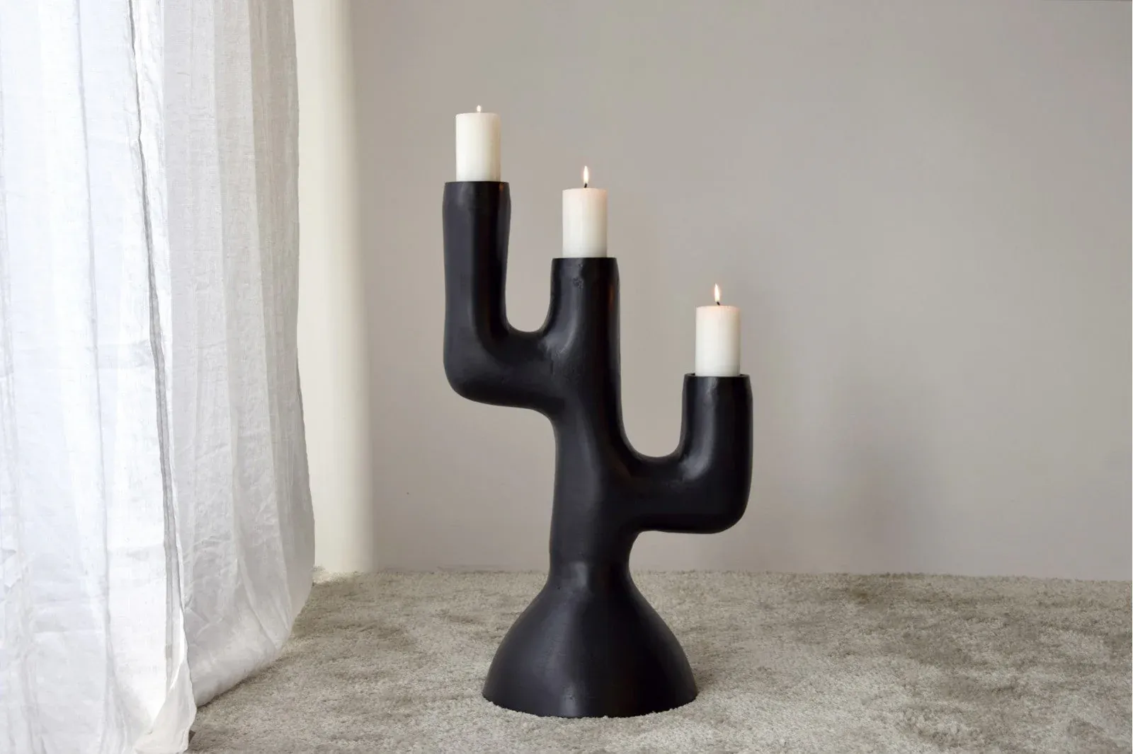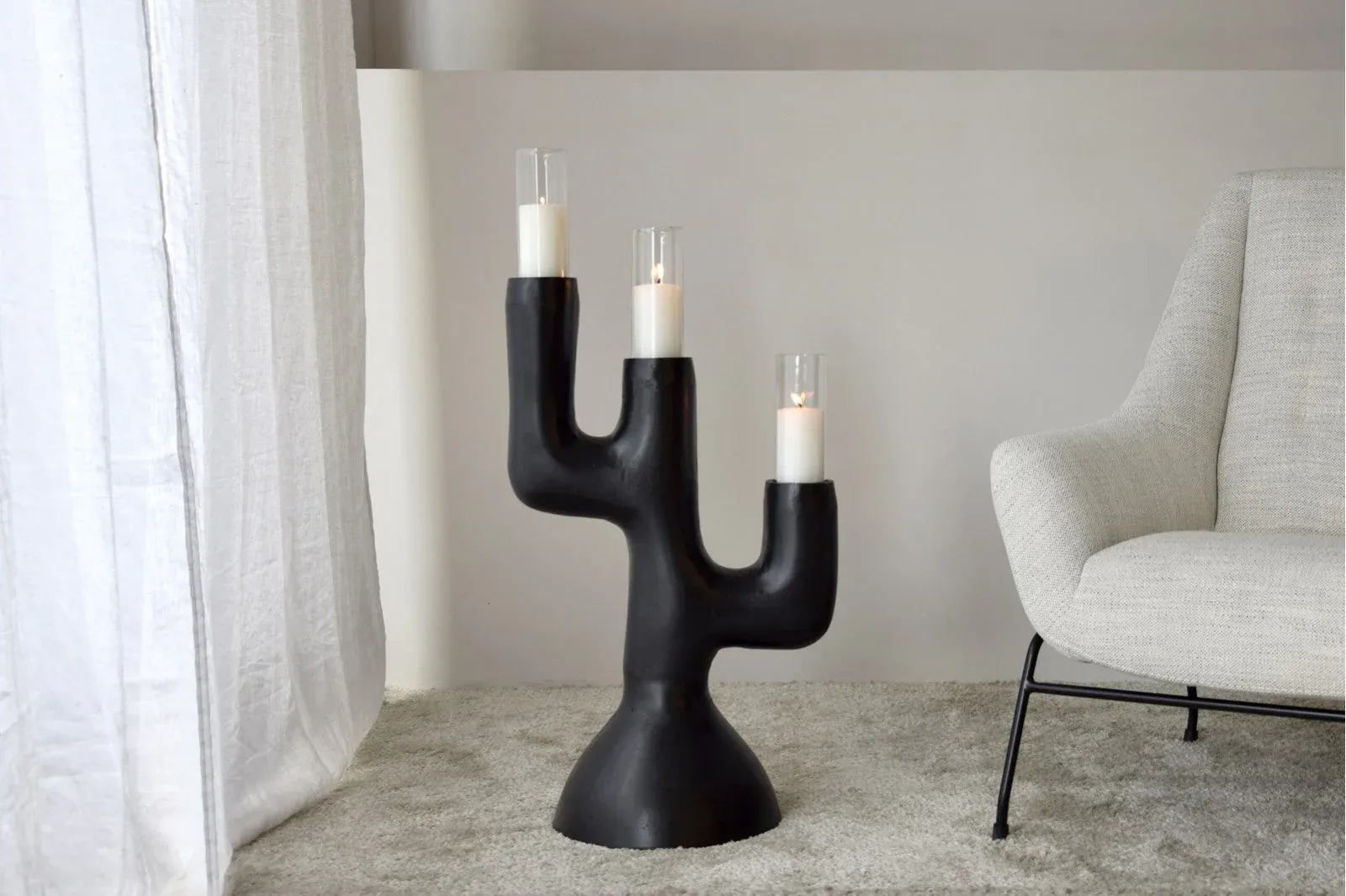 Este original candelabro fabricado en aluminio color negro con soporte para tres y nueve velas incluye protectores de vidrio para cada una de ellas.