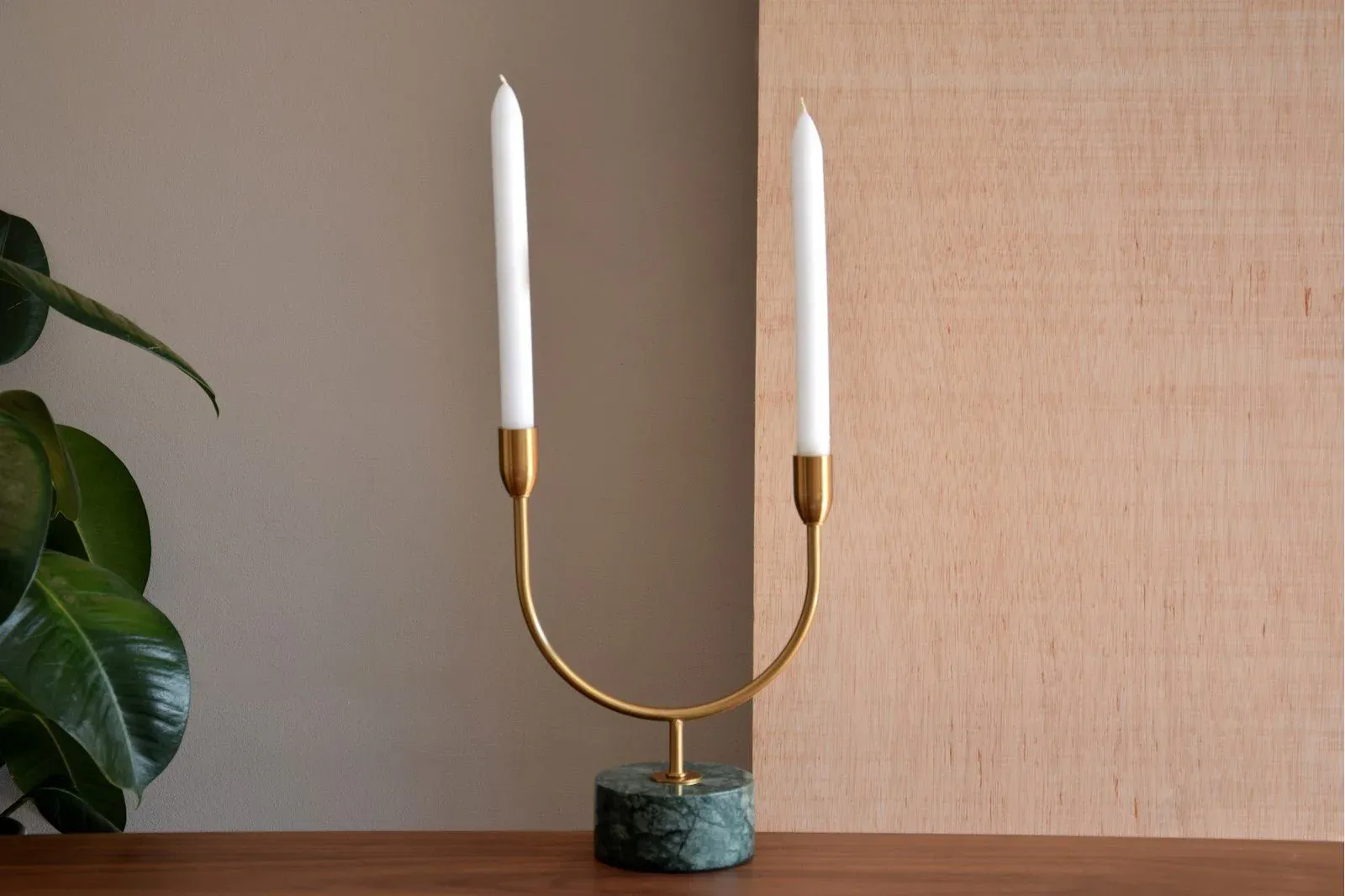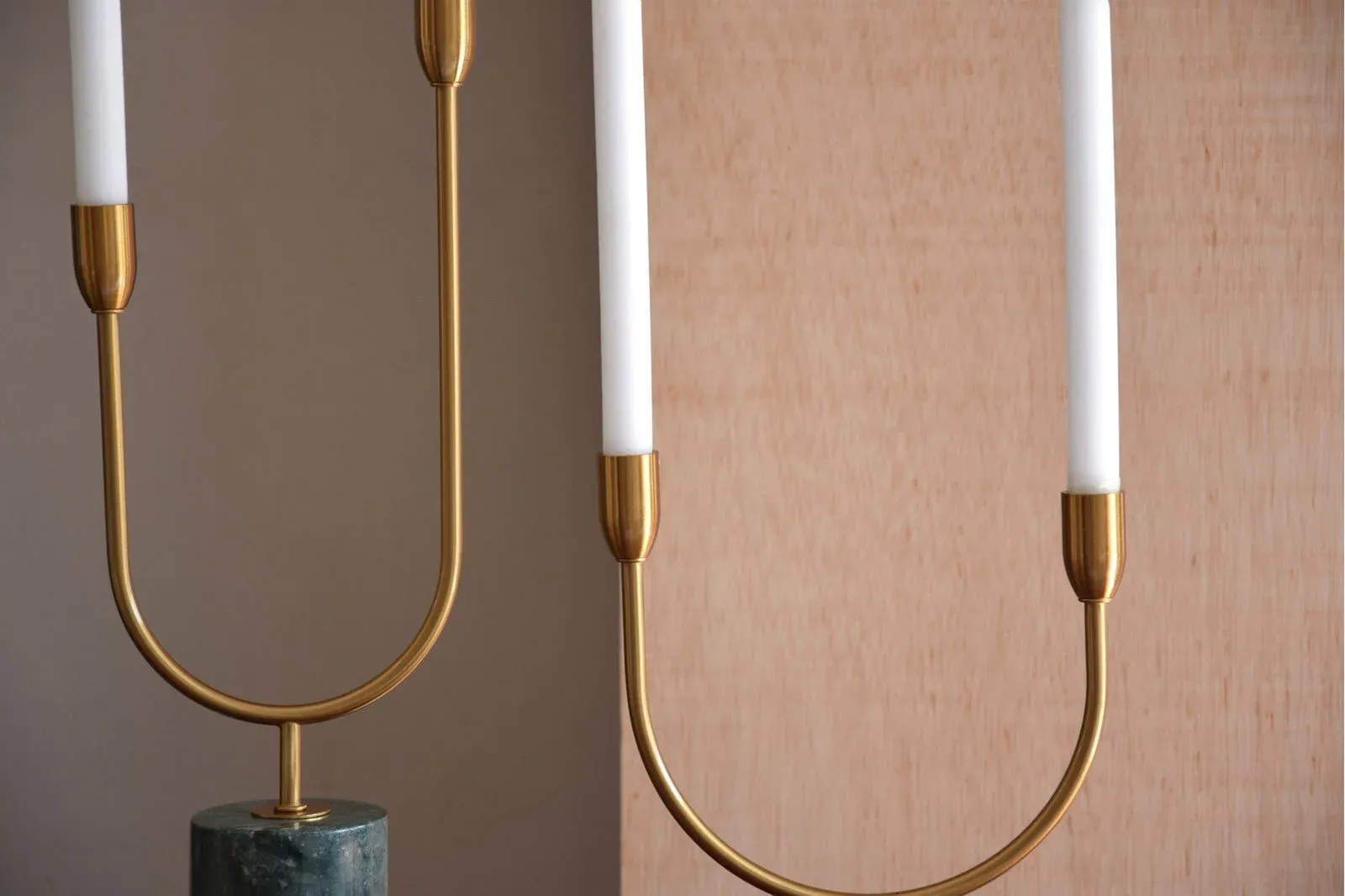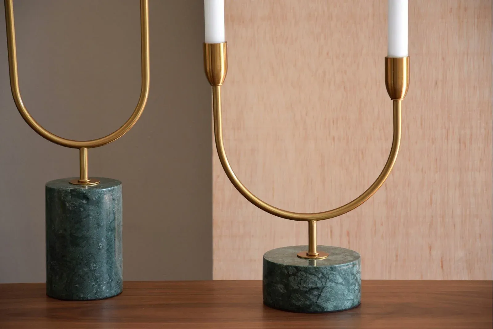Candelabro para dos velas realizado en metal con acabado latón envejecido y base en mármol tono verde jaspeado. Disponible en dos medidas diferente.