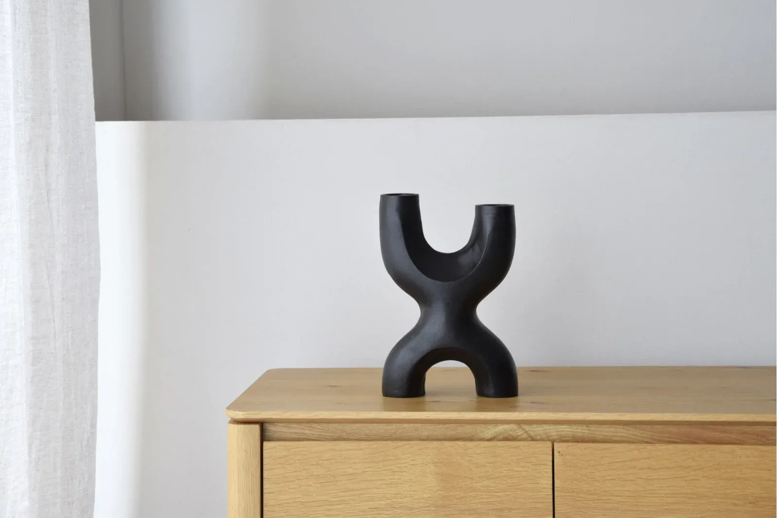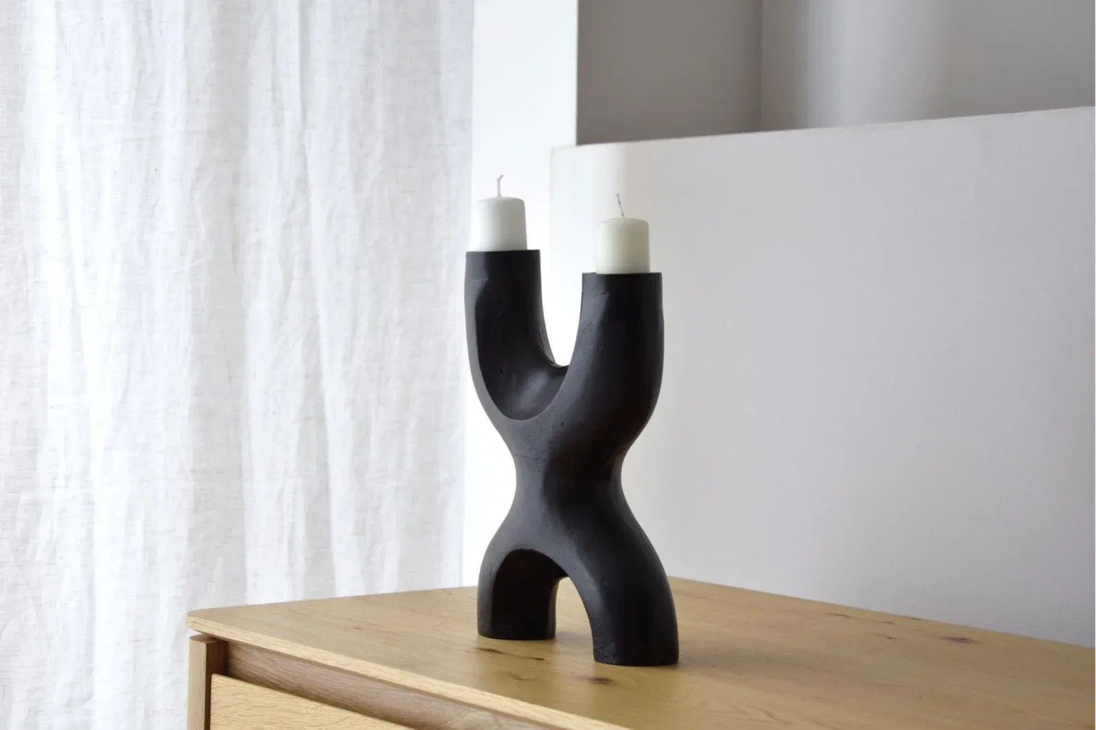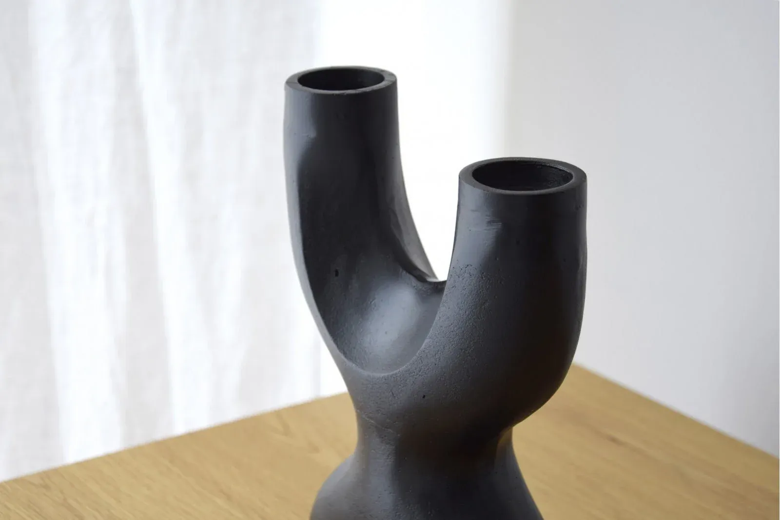 Este original candelabro fabricado en aluminio color negro realizado de forma artesanal consta para dos velas. Disponible en dos tamaños.