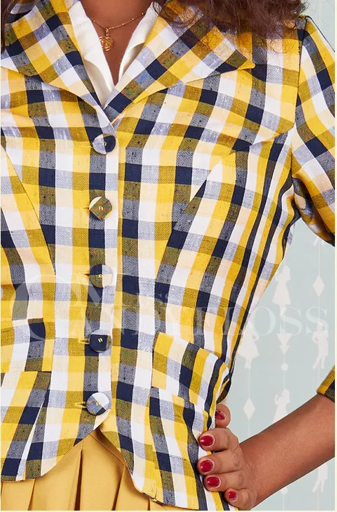 Forrada con un precioso satén amarillo para tu comodidad y confeccionada en una preciosa tela a cuadros en blanco, azul marino y amarillo, hace alarde de un cuello puntiagudo, una hilera de botones cubiertos de tela y bolsillos al frente. Con mangas ¾ y puños plegables, es ideal para darle vida a cualquiera de tus looks cotidianos, para usar en mañanas/noches ventosas o simplemente para combinar con otras capas esta temporada.
