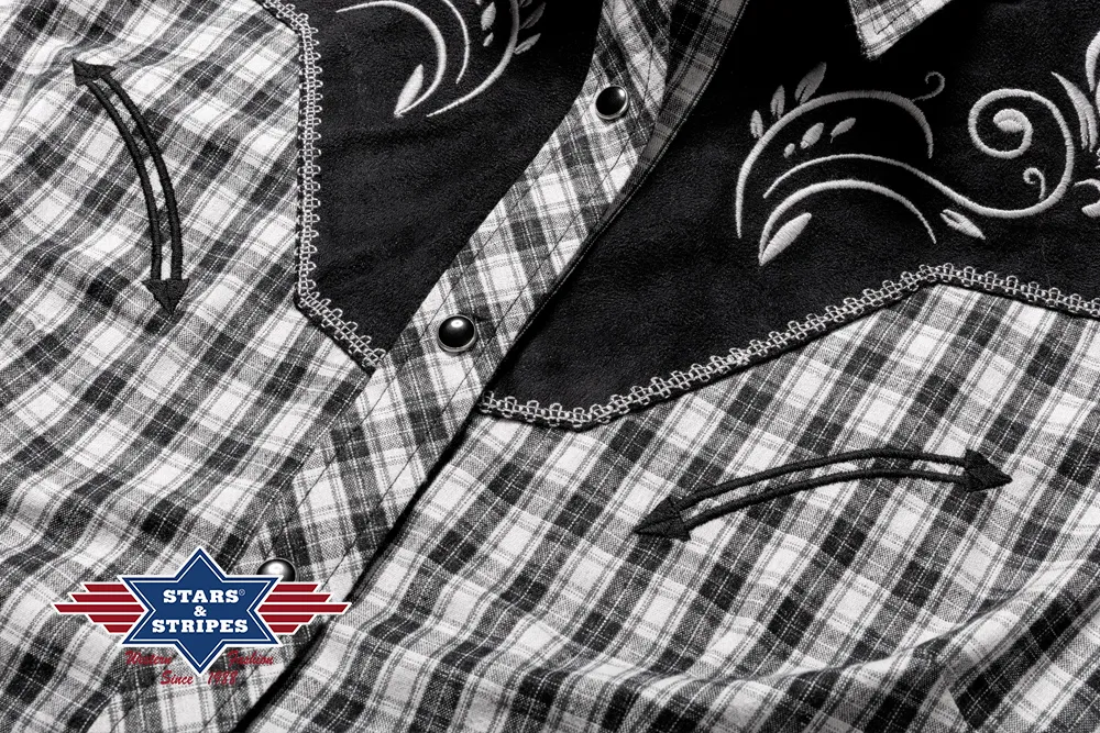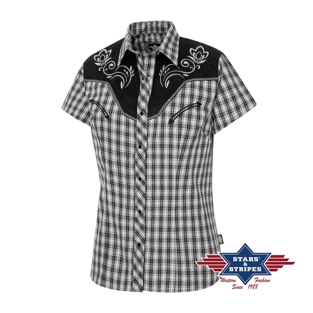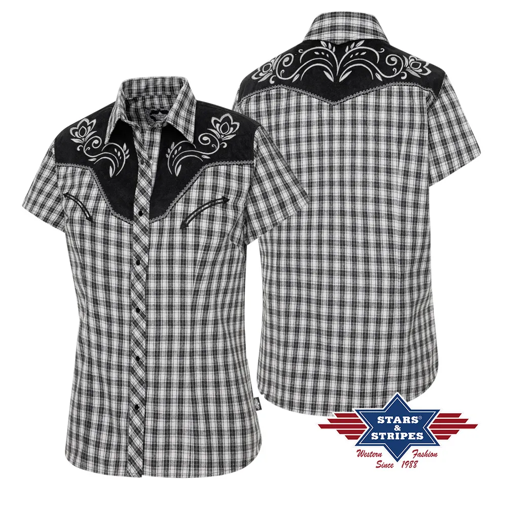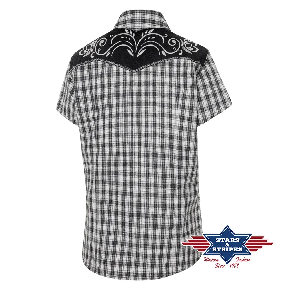 Blusa vaquera de manga corta a cuadros con canesú vaquero bordado en color contrastante y emoticones falsos. Los botones a presión a juego en la tapeta de botones hacen que la blusa sea un verdadero punto de interés. Combina con la camisa CALEB.